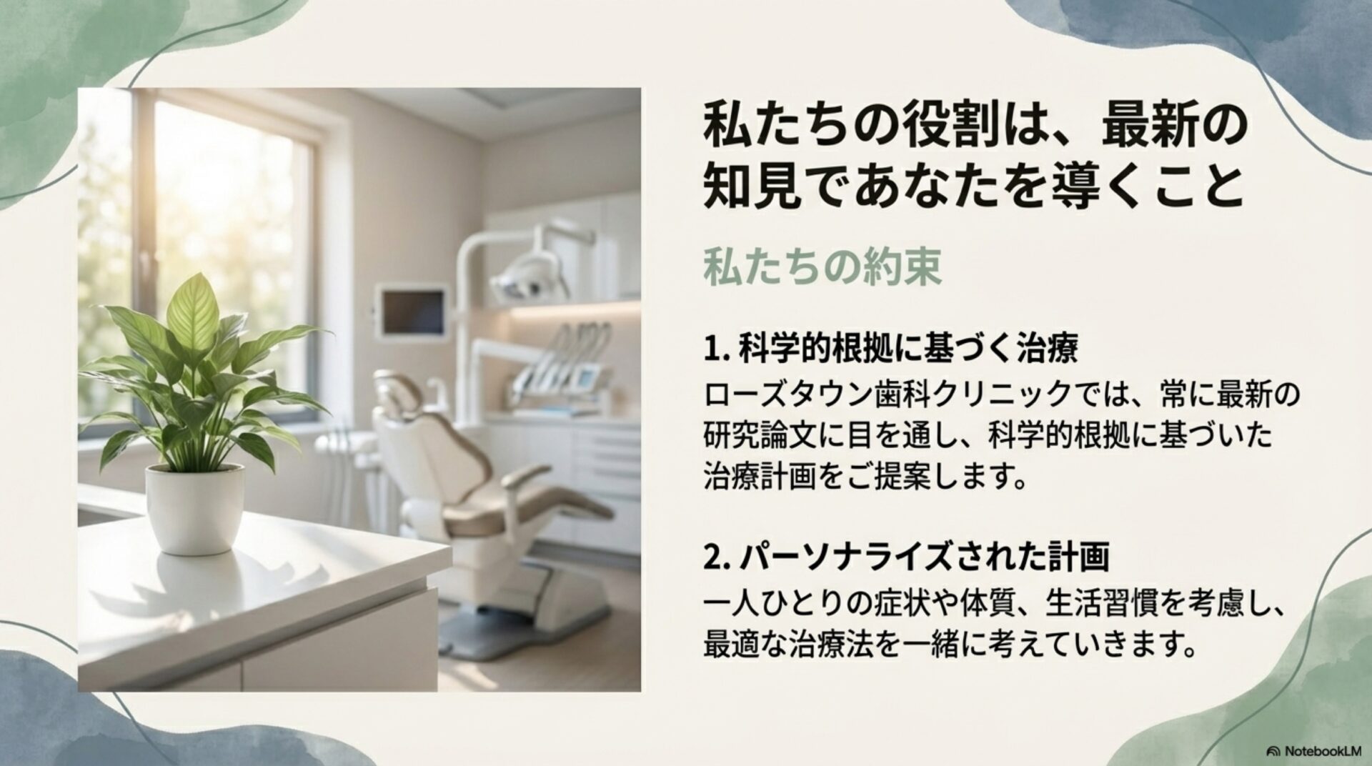 皆さま、こんにちは。私たちの歯科医院では、患者さま一人ひとりに寄り添い、最適な治療を提供することを目指しています。