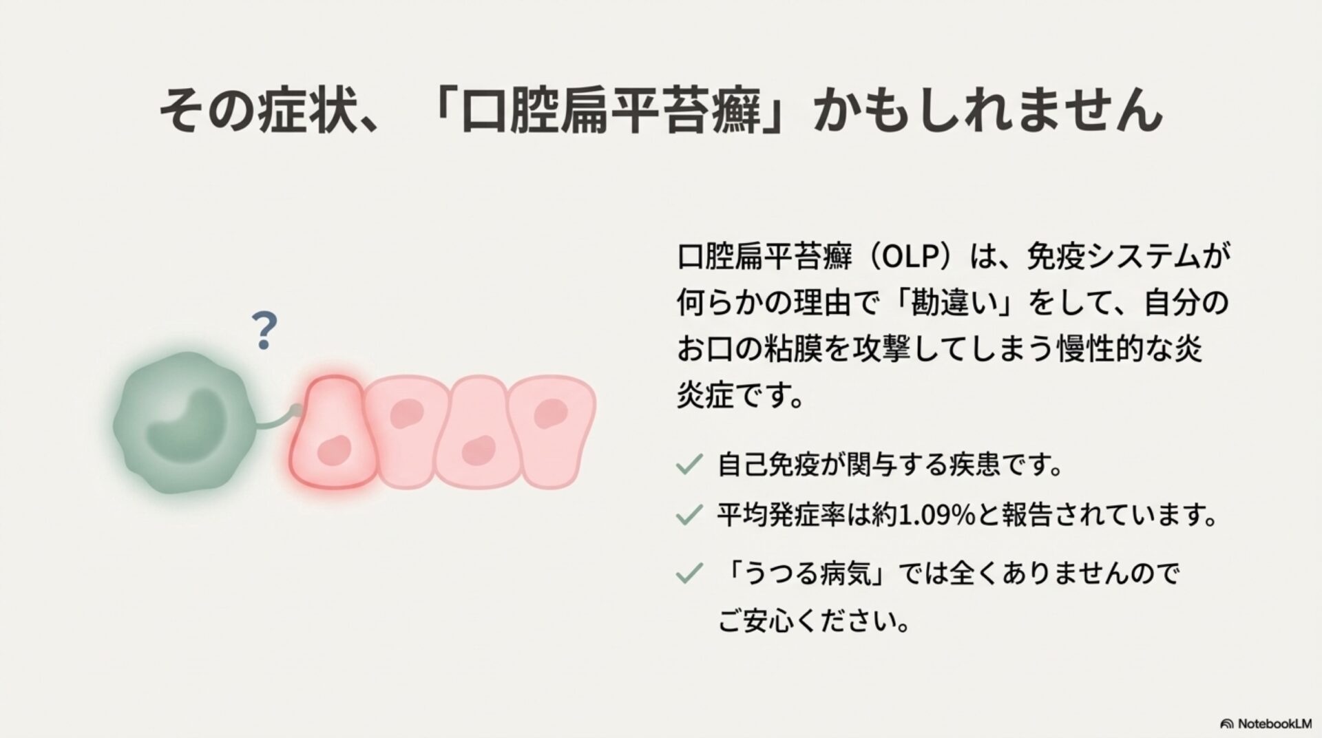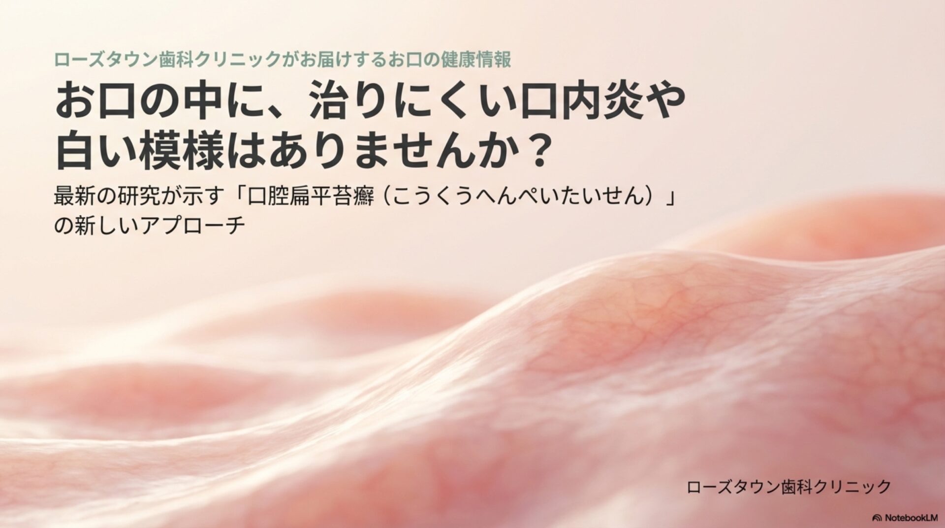 「口の中にできた痛い口内炎が、薬を塗ってもなかなか治らない…」そんな経験はありませんか?多くの方が悩まされるこの症状、実は単なる口内炎ではなく、「口腔扁平苔癬(こうくうへんぺいたいせん)」という慢性的な炎症性疾患の可能性があります。
