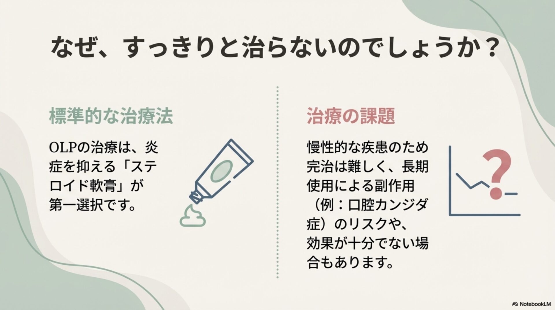 この病気は、私たちの体を守るはずの免疫系が、口の粘膜を誤って攻撃してしまうことで引き起こされます。そのため、一度発症すると治りにくく、症状が長引くことも少なくありません。臨床現場では、この”治りにくさ”が患者さんの大きなストレスになっていることを日々実感します。