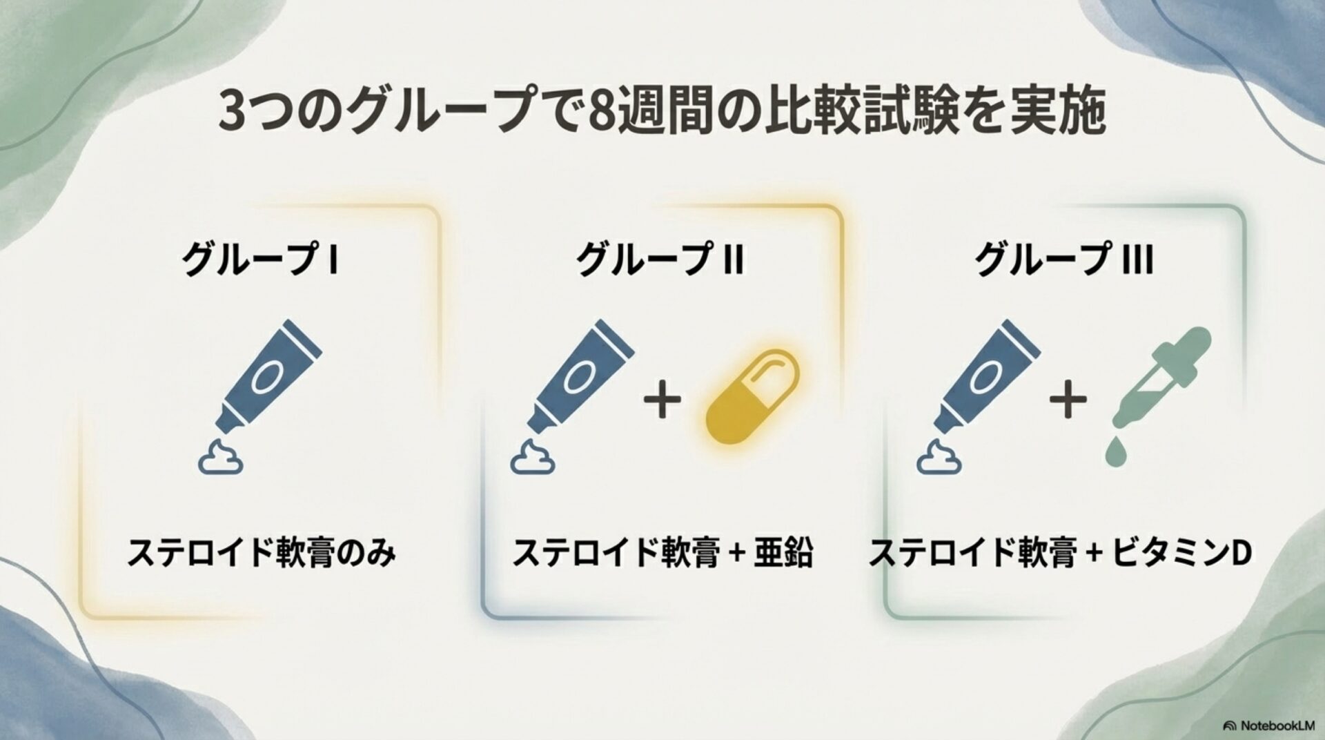 この研究では、痛みなどを伴う症状のある(萎縮性やびらん性の)口腔扁平苔癬の患者さん42名を3つのグループに分け、8週間にわたって治療効果を比較しました。第一のグループは従来のステロイド軟膏のみ、第二のグループはステロイド軟膏に全身的な亜鉛の補給(サプリメント)を、第三のグループはステロイド軟膏にビタミンDのサプリメントを併用しました。このシンプルな比較から、画期的な結果が明らかになったのです。