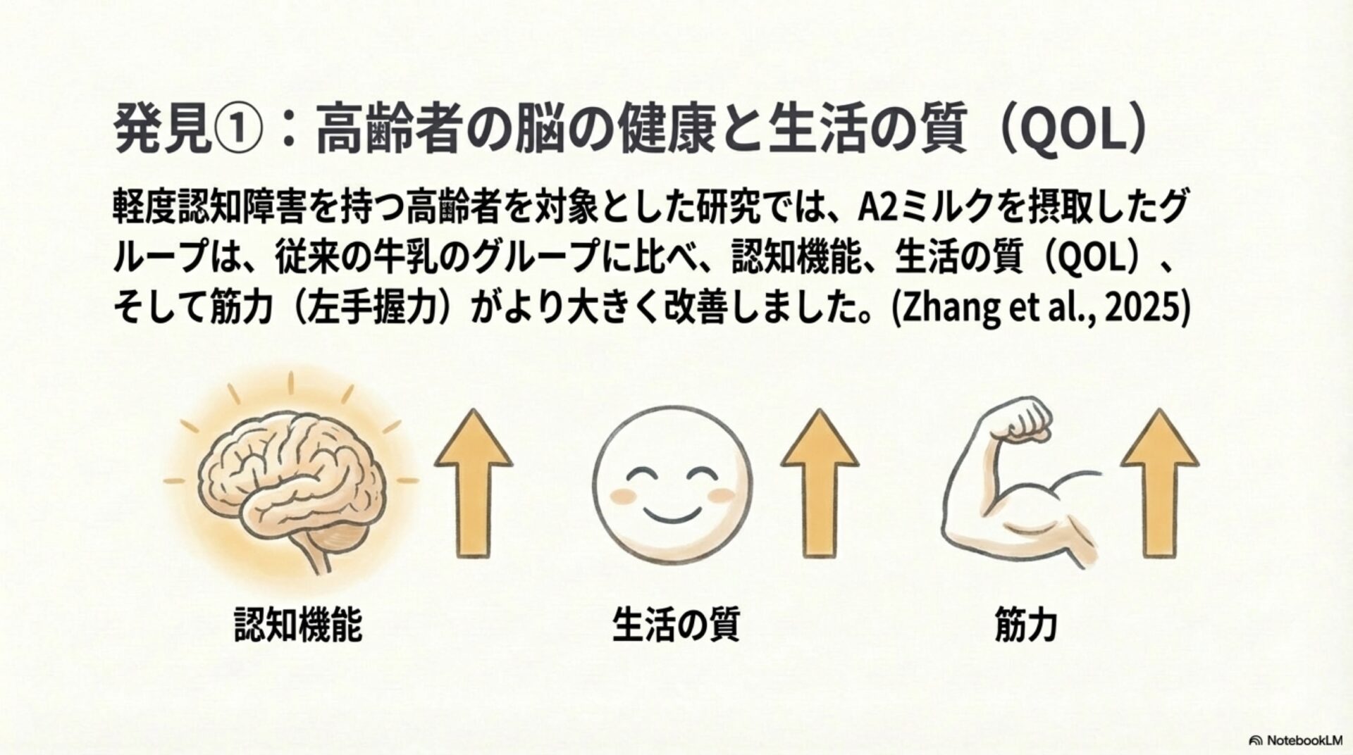 A2ミルクの潜在的なメリットは、消化器系だけにとどまらないかもしれません。軽度認知障害(MCI)を持つ高齢者(65~75歳)を対象とした二重盲検無作為化比較試験(Zhang et al., 2025)から、非常に興味深い結果が報告されました。