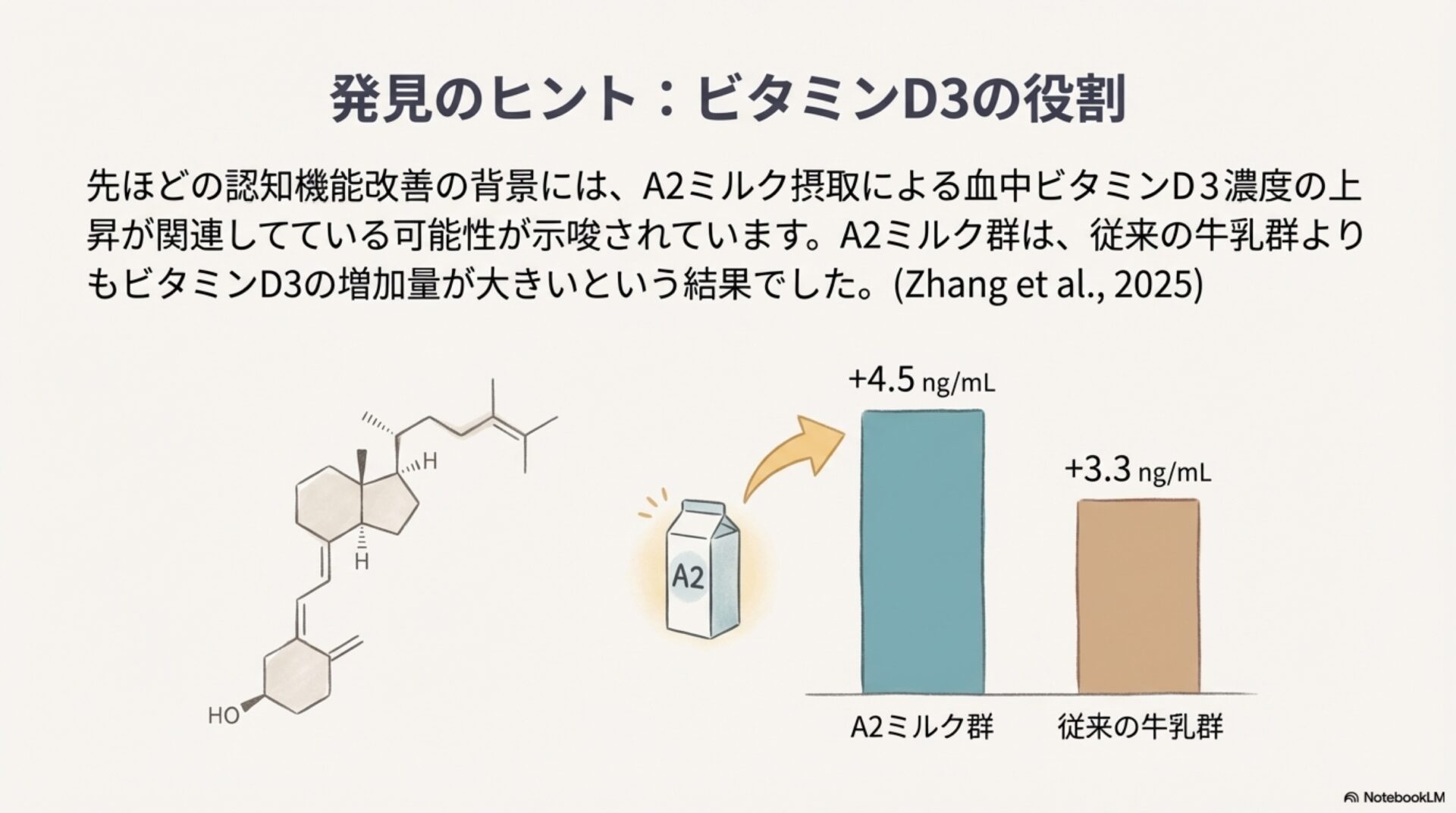 しかし、この研究の最も興味深い点は、その効果の源泉にあります。研究者たちは当初、これらの効果は抗酸化物質であるグルタチオン(GSH)の増加に関連していると仮説を立てていましたが、結果はそうではありませんでした。代わりに、A2ミルクグループで血清中の25-ヒドロキシビタミンD3レベルがより大きく増加したこととの関連性が示唆されています。