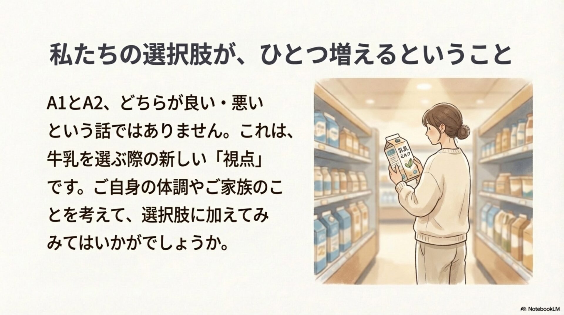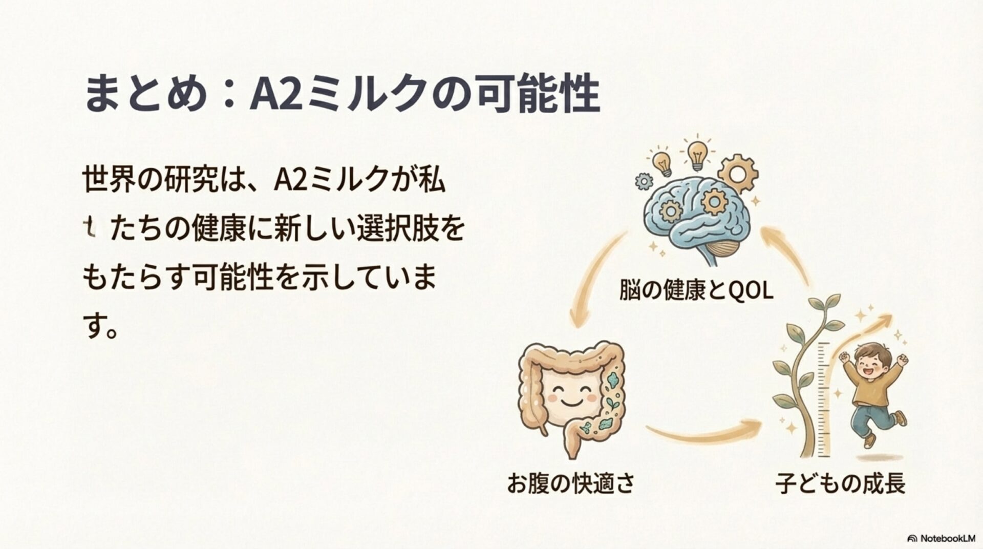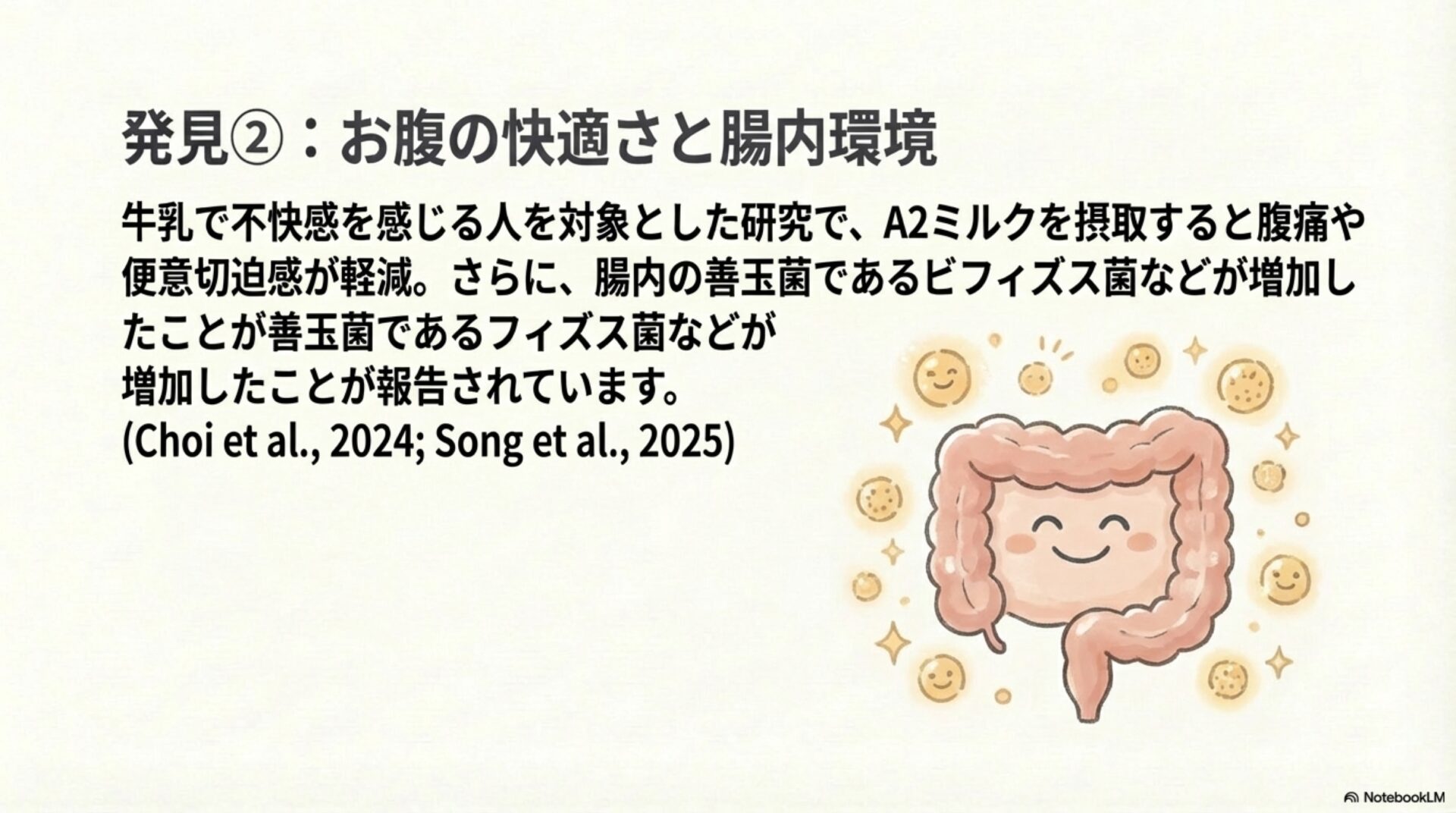 つまり、これらの研究が示唆しているのは、A2ミルクが単に刺激物を「避ける」だけでなく、善玉菌を積極的に「育て」、炎症を「抑える」ことで、より健康な腸内環境を育む可能性があるということです。
