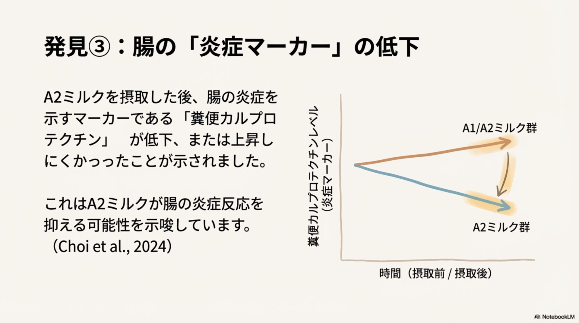 さらにChoiらの研究では、腸の炎症の有無を測る指標(マーカー)である「糞便中カルプロテクチン」のレベルにも着目しました。その結果、A2ミルクを摂取した後では、この数値が減少、または上昇度合いが少ないことがわかり、A2ミルクが腸の炎症を軽減する可能性が示唆されました。