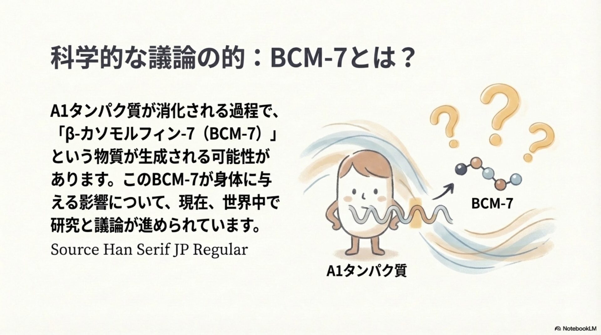 では、「A1 β-カゼインは体に悪く、A2 β-カゼインは良い」という単純な物語がすべてなのでしょうか? 最新の非常に詳細な科学的分析は、現実がもっと複雑であることを示唆しています。近年の科学は、このシンプルなストーリーに2つの側面から疑問を投げかけています。一つは、そもそも「悪役」とされてきたものは何なのか(BCM-7というペプチドそのものなのか)を問い直す研究で、もう一つは、A1かA2かという違いが、本当にすべての人にとって最も重要な要因なのかを問う研究です。