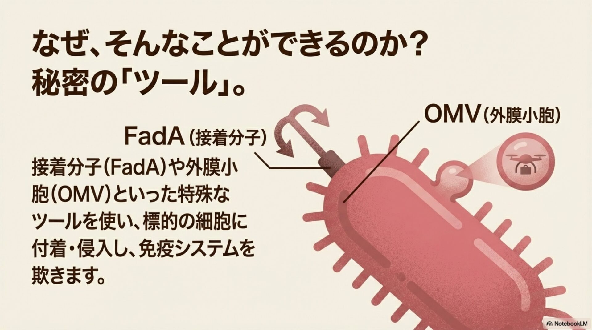 - 関節リウマチ (Rheumatoid Arthritis): この細菌が放出する外膜小胞(OMV)が、FadAという接着因子を関節まで運び、症状を悪化させる可能性があります。
