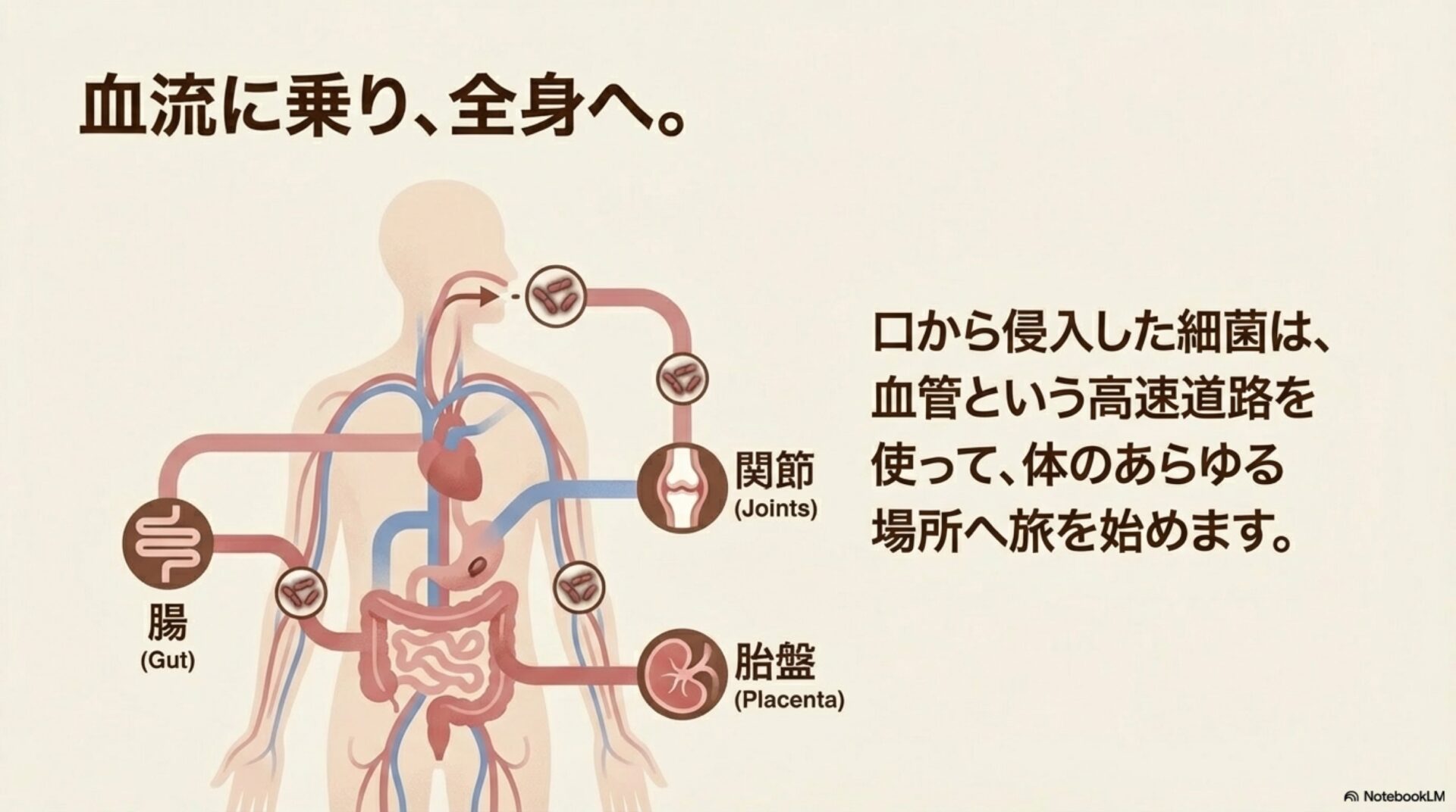 「越境病原体」とは、口や腸などの粘膜バリアを突破し、血流に侵入して、本来いるべき場所から遠く離れた臓器や組織に定着し、そこで病気を引き起こす能力を持つ病原体を指します。Fnはまさにこの性質を持ち、口の中から全身へと影響を及ぼす可能性を秘めているのです。