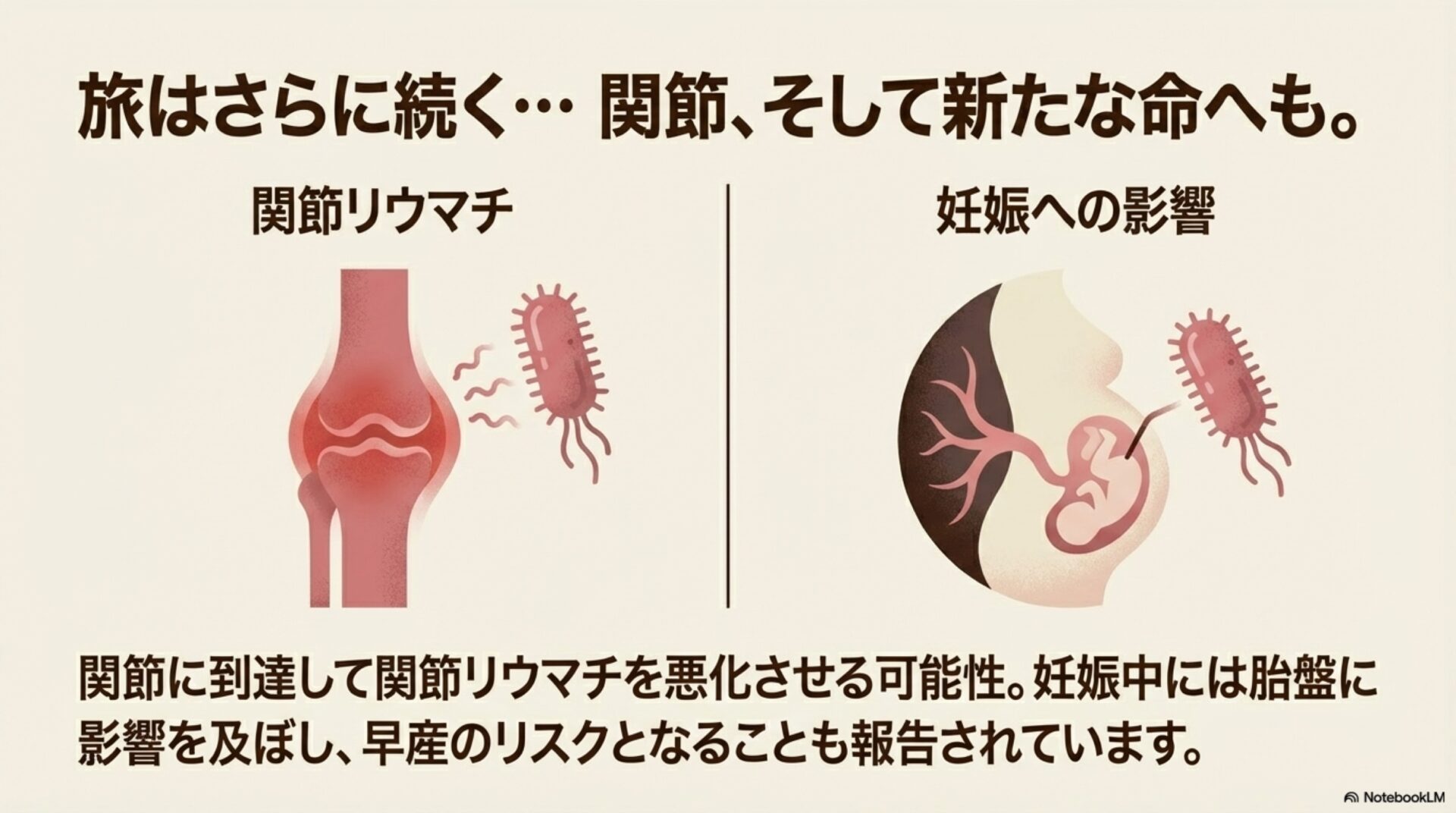 - 早産 (Preterm Birth): 胎盤に侵入して炎症を引き起こし、早産などの合併症の原因となることがあります。