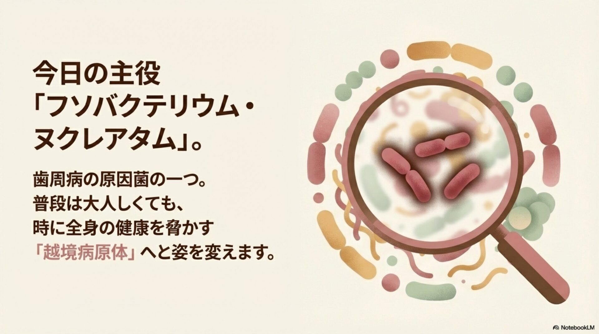 この記事では、そうした細菌の中でも特に注目されている「フソバクテリウム・ヌクレアタム」という細菌に焦点を当て、その驚くべき正体と私たちの健康への影響について、専門家の視点から分かりやすく解説していきます。
