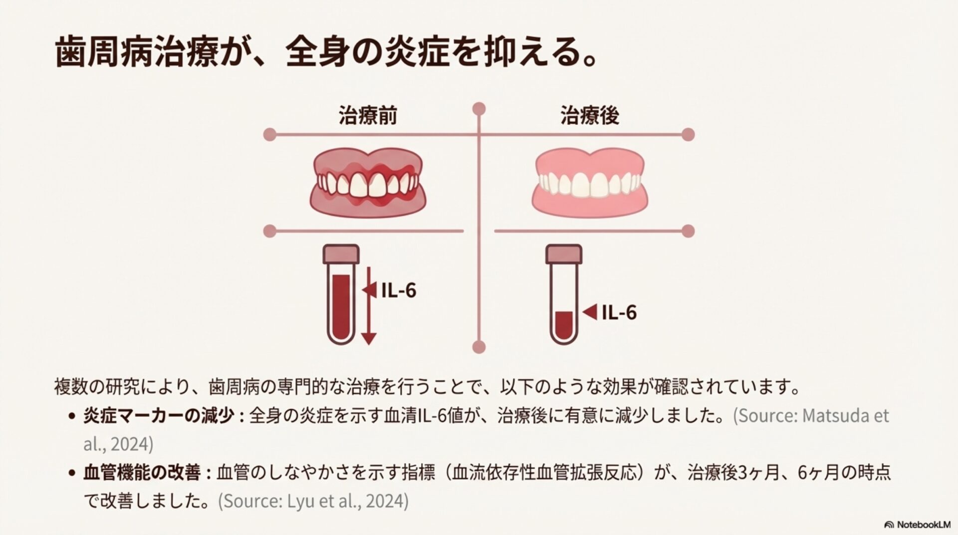 これは、歯茎の治療が単に口の中をきれいにするだけでなく、文字通りあなたの血管を「癒す」力を持っていることを示す、力強い科学的証拠なのです。