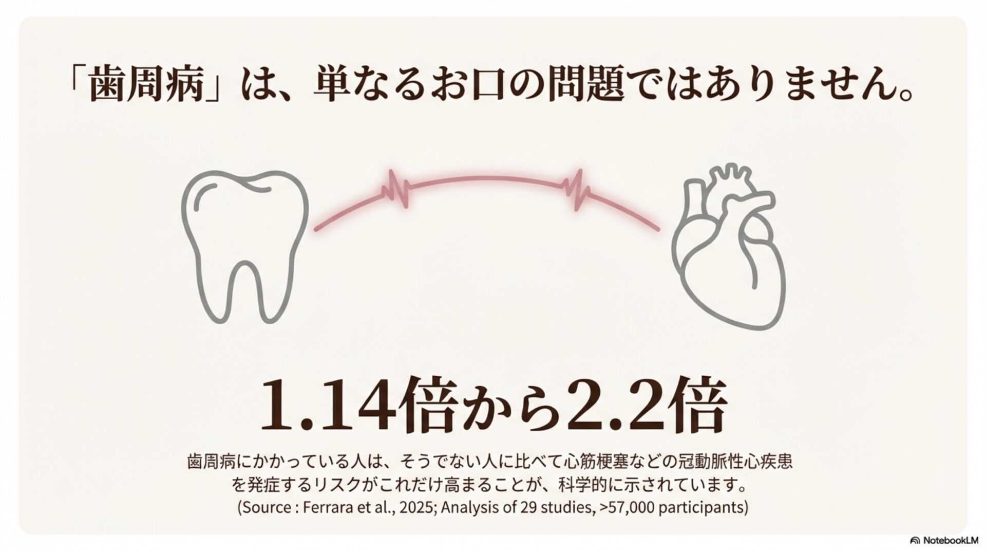 このつながりは、単なる可能性の話ではありません。複数の研究を分析した結果、歯周病にかかっている人は、冠状動脈性心疾患を発症するリスクが1.14倍から2.2倍も高まることが示されています。これは、歯茎のケアを単なる口内衛生の問題としてではなく、全身の健康を守るための重要な生活習慣として捉え直すべき、強力な理由と言えるでしょう。