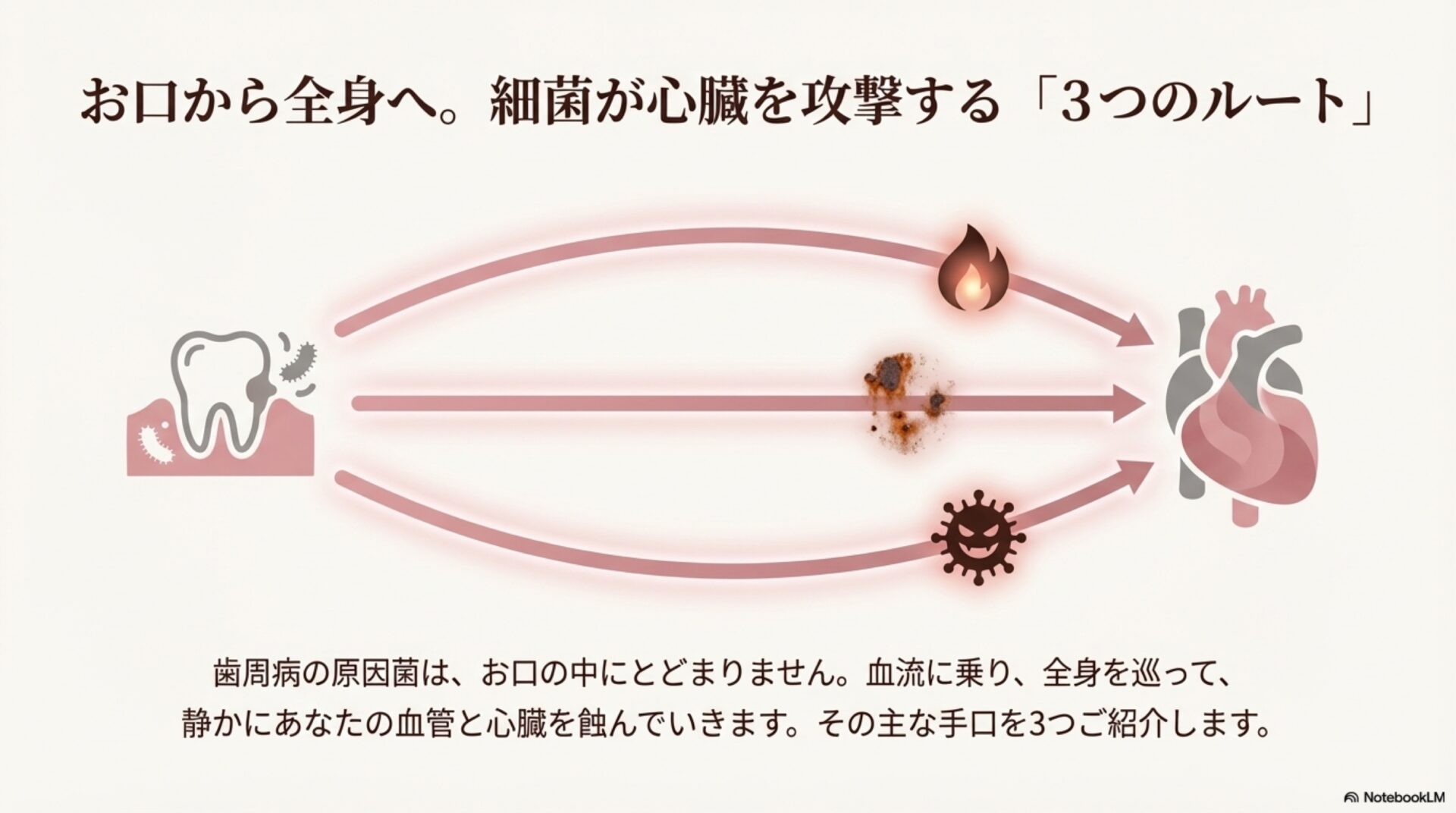 私たちの口と体は決して別々のものではありません。歯茎の炎症は、口の中だけの問題にとどまらず、全身に深刻な影響を及ぼす可能性があります。細菌のチームプレー、免疫システムの誤作動、そして善玉物質の裏切りといったメカニズムを理解すると、なぜ積極的なデンタルケアが全身の健康管理に不可欠なのかがよくわかります。