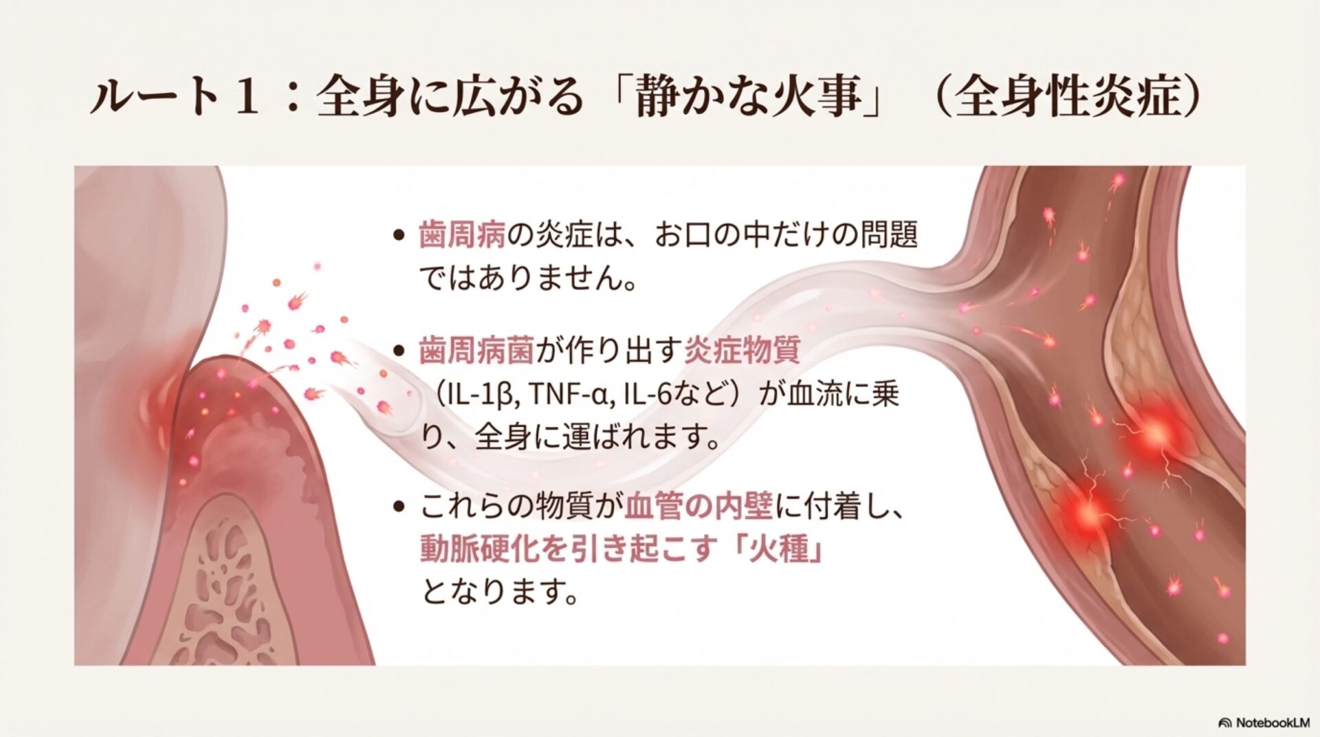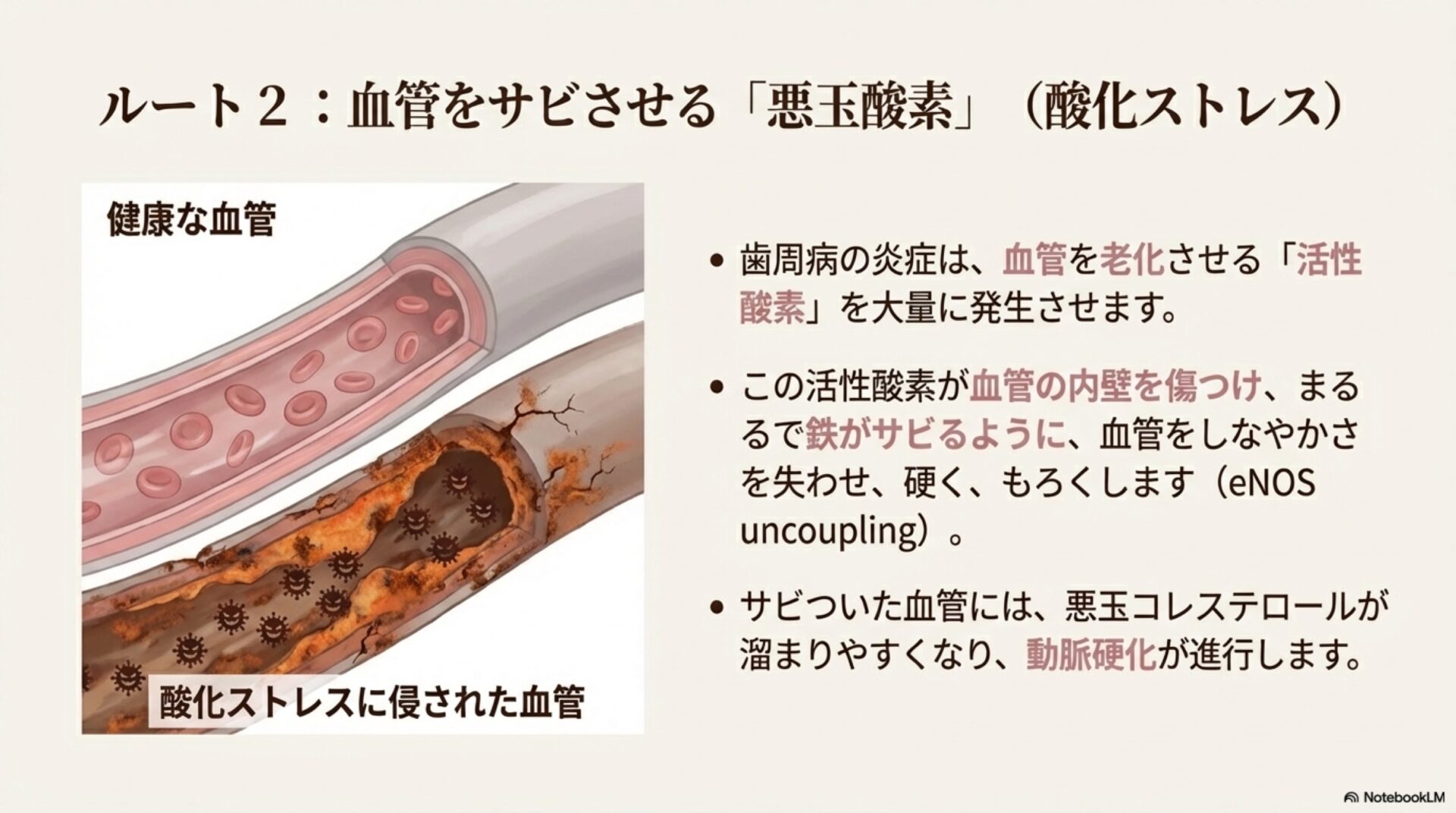 しかし、歯周病によって引き起こされる慢性的な炎症状態では、この常識が覆ります。炎症によって体内では大量の有害な「スーパーオキシド」という物質が生成されます。本来有益であるはずの一酸化窒素が、このスーパーオキシドと反応すると、「ペルオキシナイトライト」という非常に毒性の高い物質に変化してしまうのです。このプロセスは、有害物質を生み出すだけでなく、本来血管を守るはずだった善玉の一酸化窒素の量をも減少させてしまい、血管がダメージを受けやすくなるという悪循環に陥るのです。