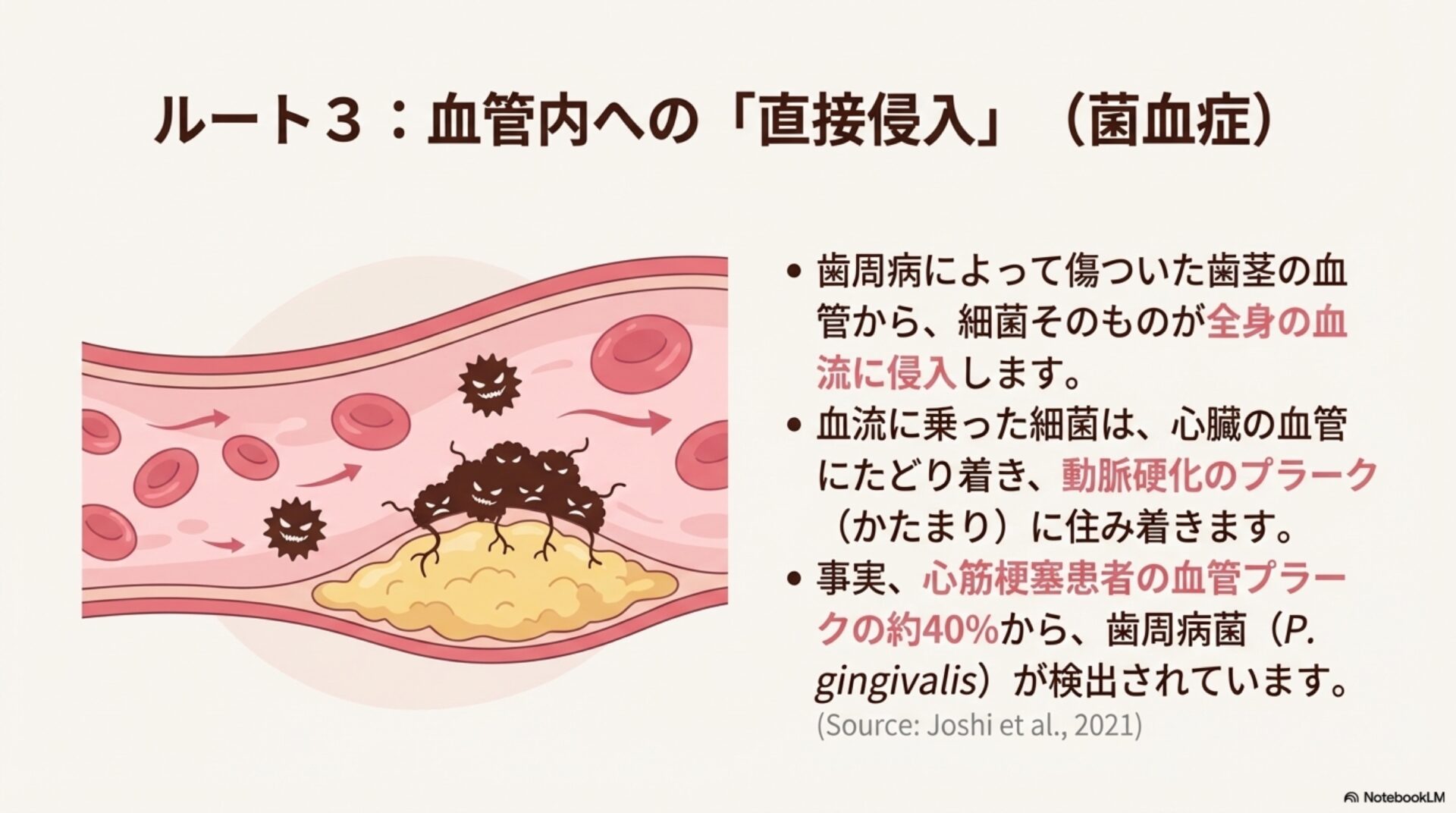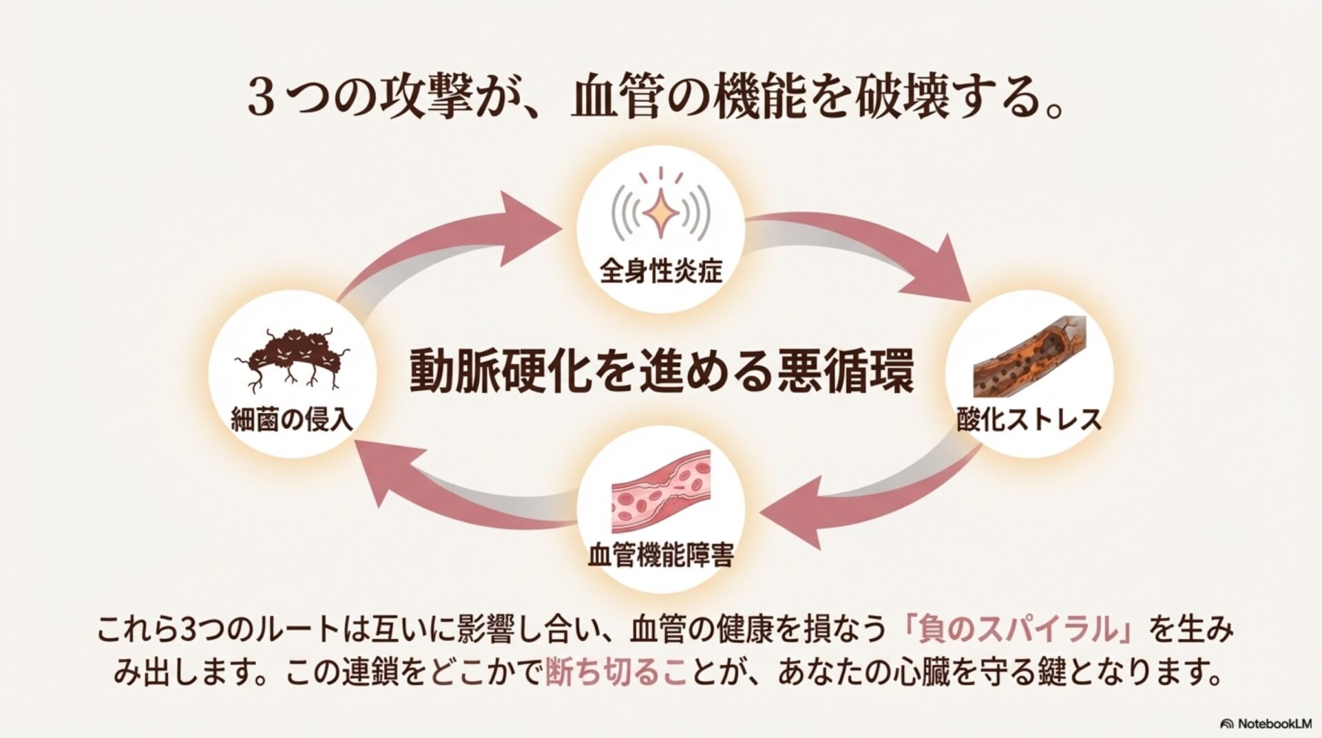 この細菌たちのチームプレーは、体内の炎症反応を劇的に増幅させます。その影響は深刻で、ある研究では、これらの病原菌に対する抗体反応が高く、かつ体内の炎症マーカーも上昇している患者は、心血管イベント(心筋梗塞など)を起こすリスクが3.01倍から3.11倍にも達することがわかりました。これは、口の中の悪玉菌チームが、心臓にとって3倍以上の脅威になり得ることを意味しています。