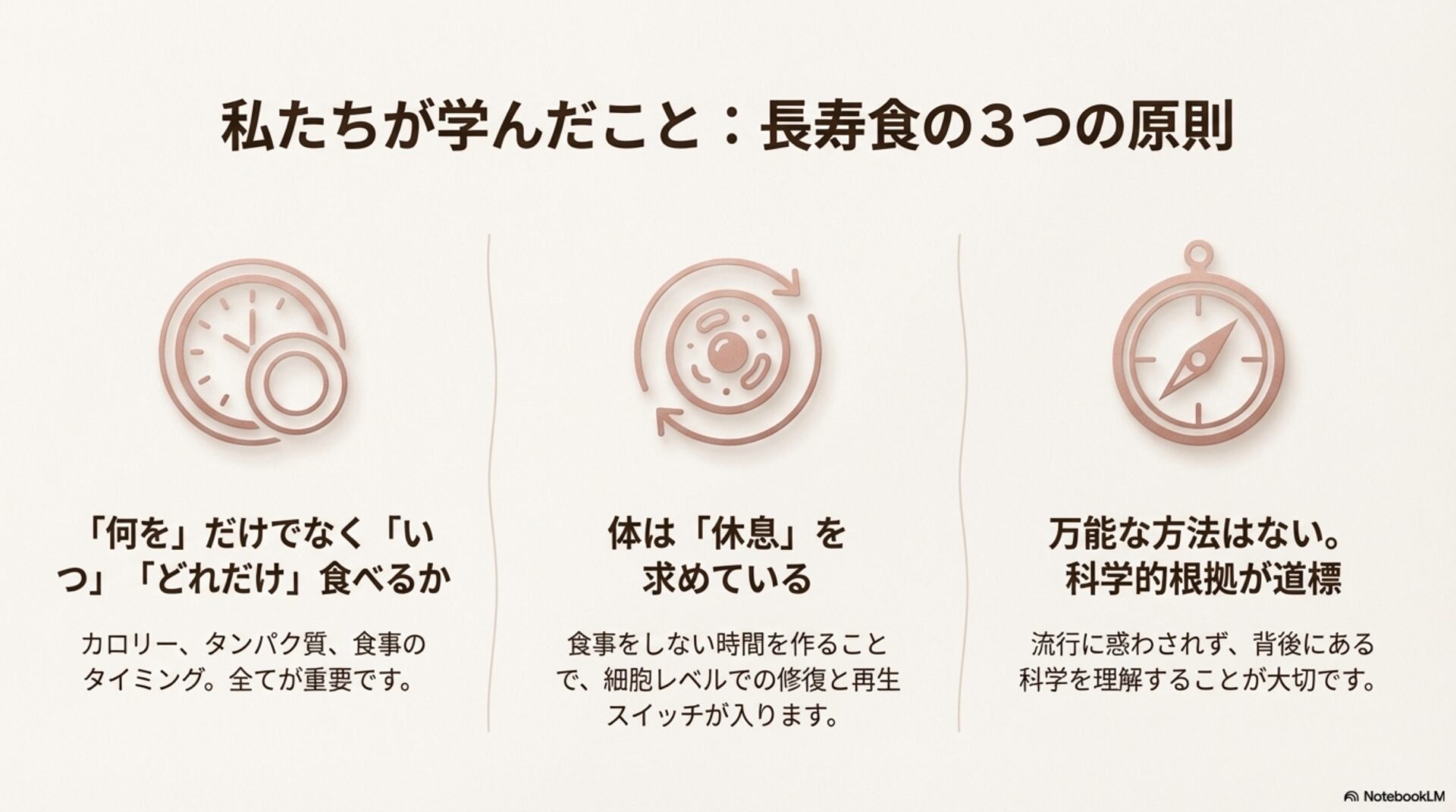 最新の科学は、長寿のための食事法が単なる「カロリー計算」から、より深く、多角的な視点へと進化していることを示しています。何を食べるか(タンパク質の供給源や特定のアミノ酸)、そしていつ食べるか(食事の時間帯)という視点が、健康寿命を延ばすための、これまでの常識を覆す新たな鍵となりつつあります。