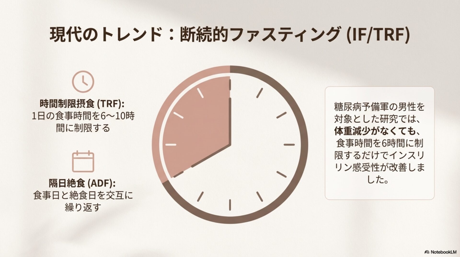 これは、食事をしない「断食時間」を設けること自体が、カロリー摂取量を減らすこととは独立して、代謝の健康に良い影響を与えることを示唆しています。つまり、「何を食べるか」だけでなく、「いつ食べるか」が私たちの健康にとって重要な要素なのです。