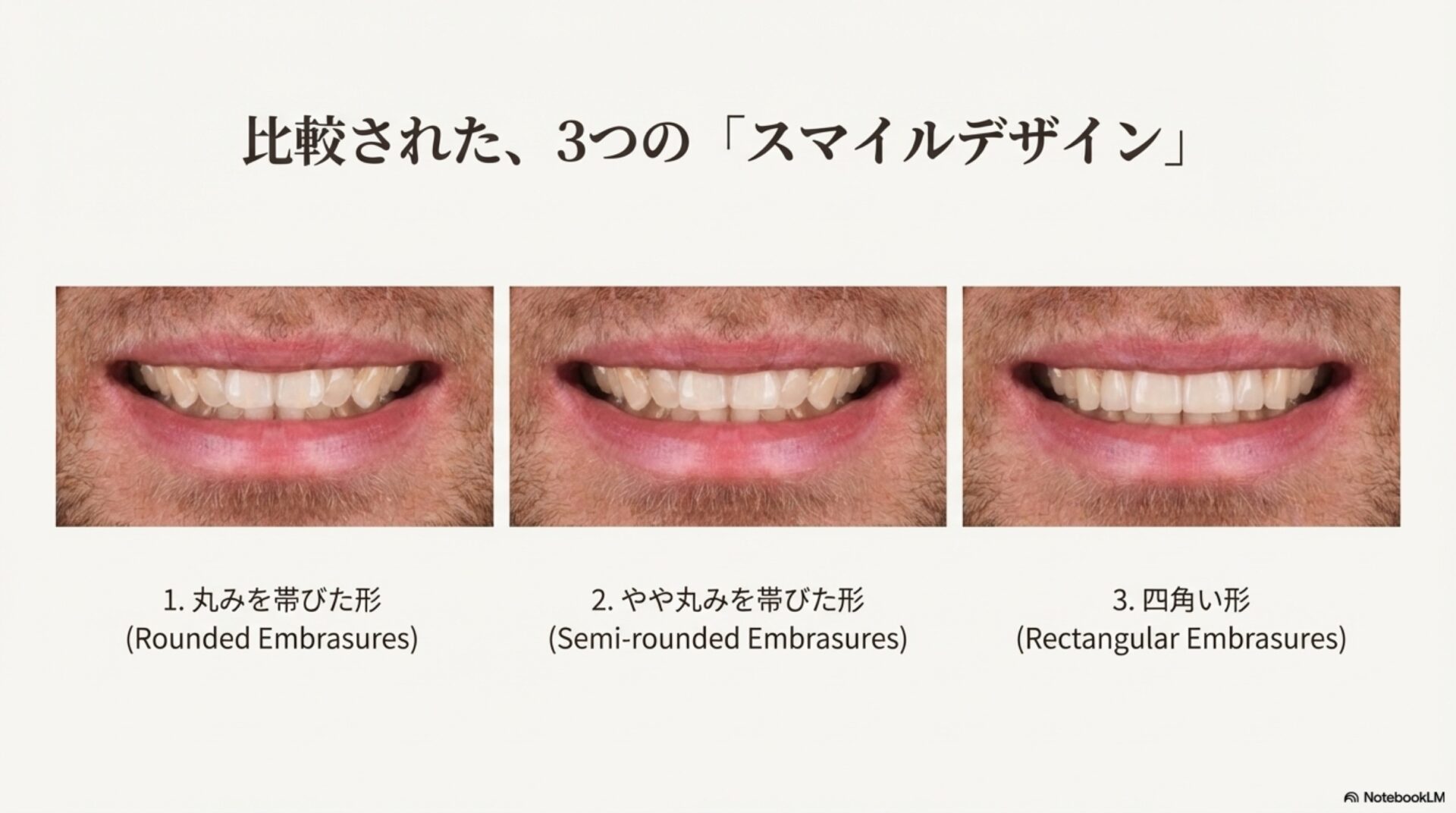 この研究の最も明確な発見は、切縁空隙の「形」に関するものでした。参加者(歯科医と一般の人々)は一貫して、研究で使われた男性モデルの、先端の角が丸みを帯びて隙間が自然に開いている笑顔(画像1)を最も魅力的だと評価しました。