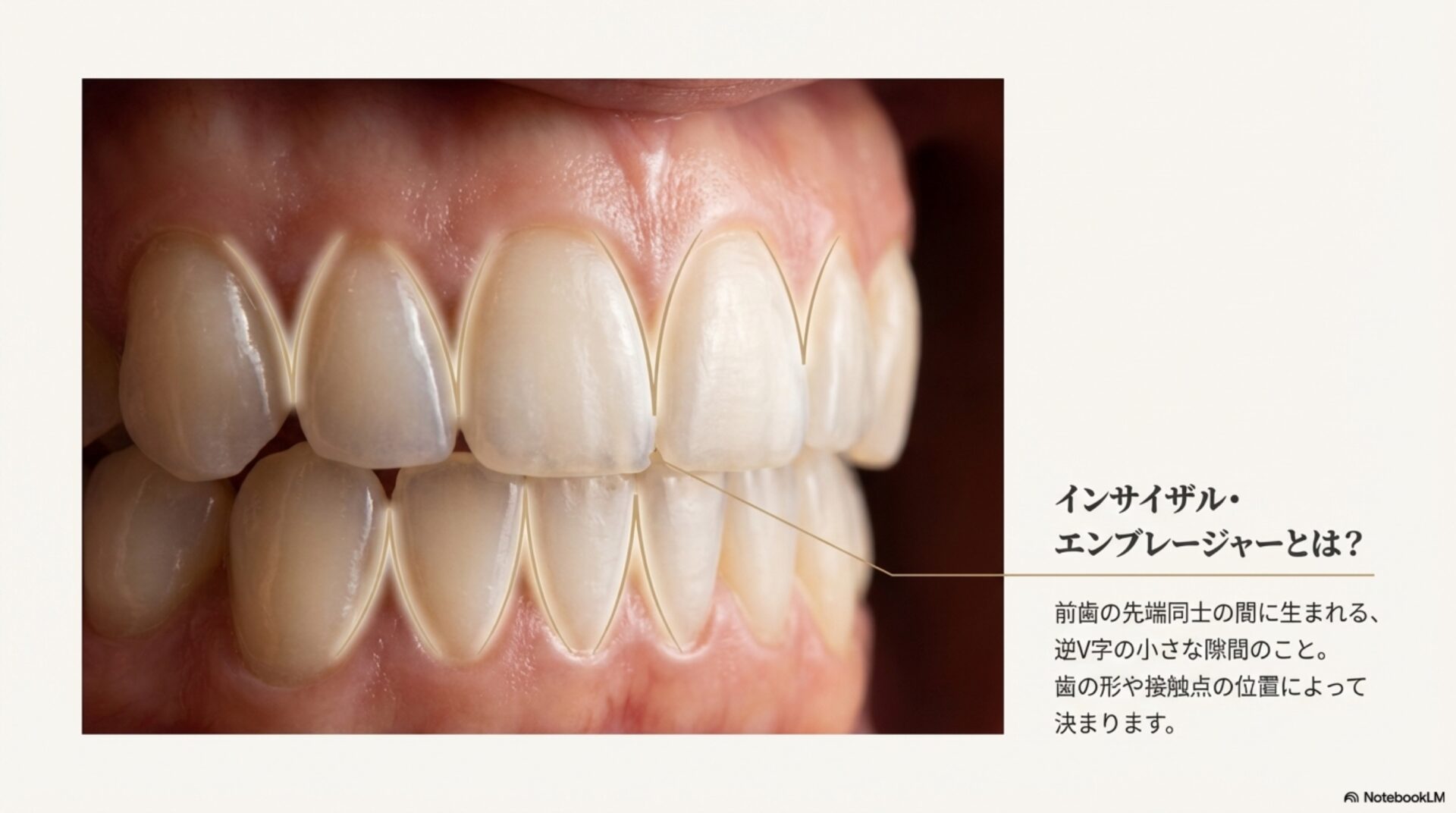 それが「切縁空隙(インサイザル・エンブレージャー)」です。専門用語で難しく聞こえますが、これは「上の前歯の先端と先端の間にある、小さなV字型の隙間」のことを指します。実はこの隙間、歯の解剖学的な特徴から、真ん中の2本の歯の間は小さく、外側に向かうにつれて徐々に大きく、そして非対称になっていくのが自然な姿です。
