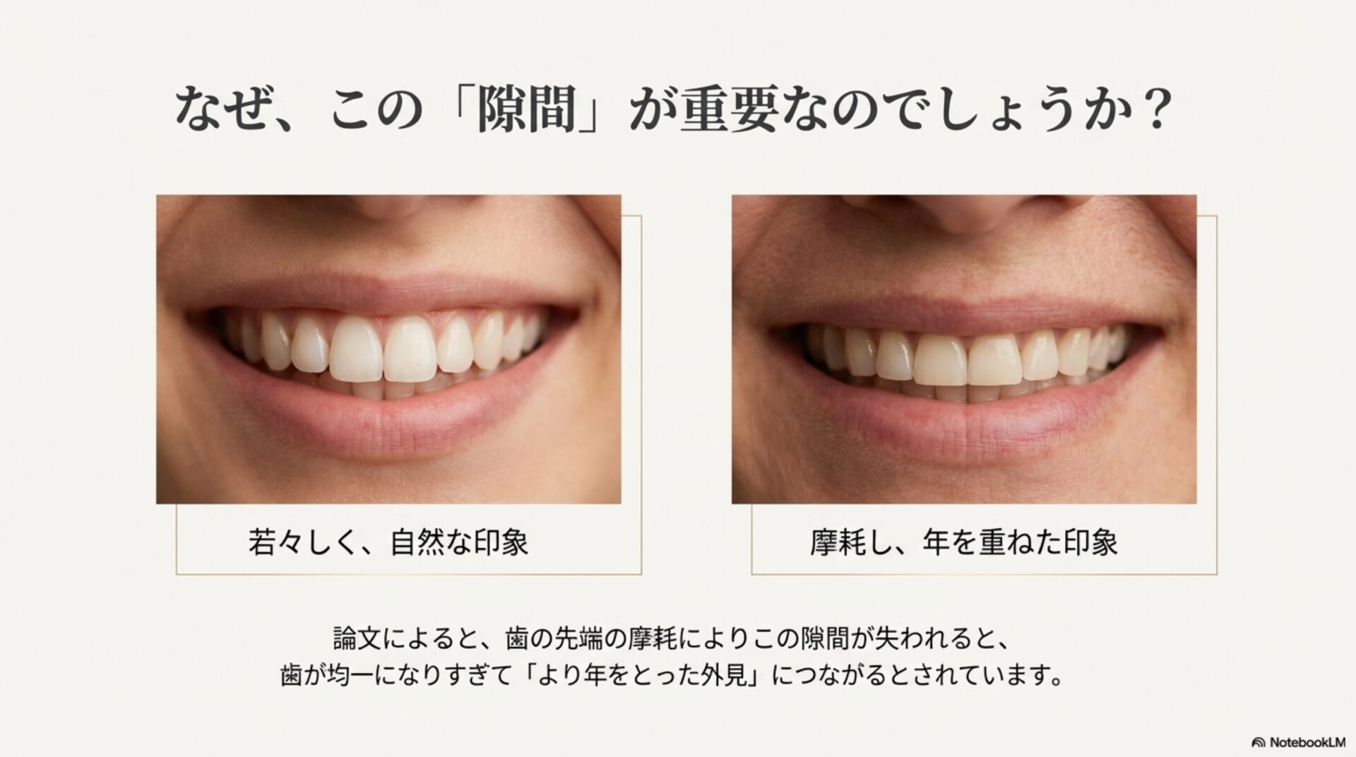 なぜこのような結果になったのでしょうか。これは、歯の先端の摩耗と深く関係しています。歯は年齢と共に自然にすり減り(咬耗)、切縁空隙は不明瞭になっていきます。つまり、角がすり減って平らになった歯は、無意識のうちに「老けた印象」を与えるサインとなるのです。一方で、適度に丸みを帯びたはっきりとした隙間は、若さと生命力を感じさせ、私たちの目に魅力的に映ると考えられます。