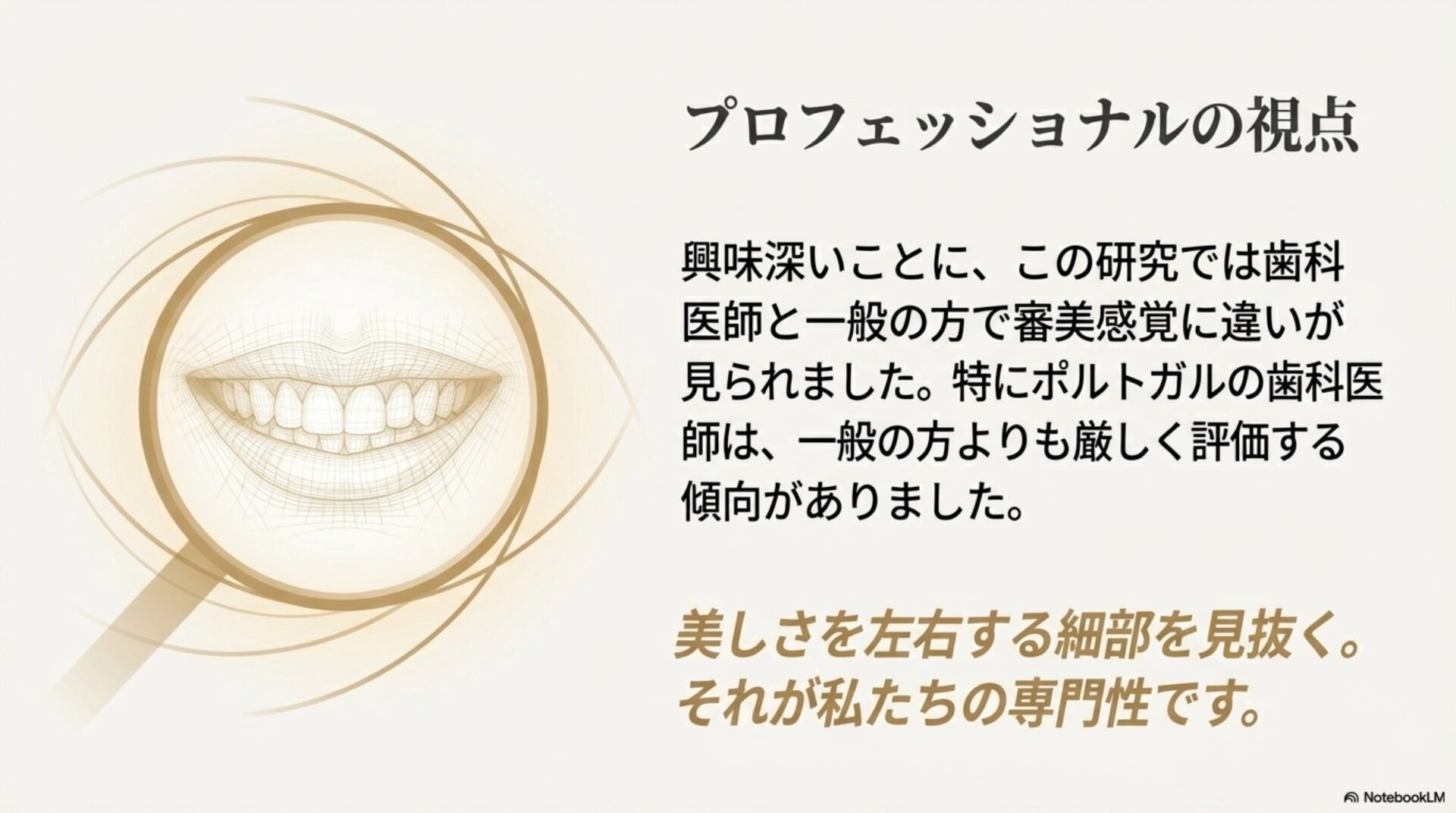 この記事で見てきたように、美しい笑顔の認識は、歯の先端にあるわずかな隙間の形といった繊細なディテールや、それを見る人の専門性、国、性別といった多様な要因に影響されます。