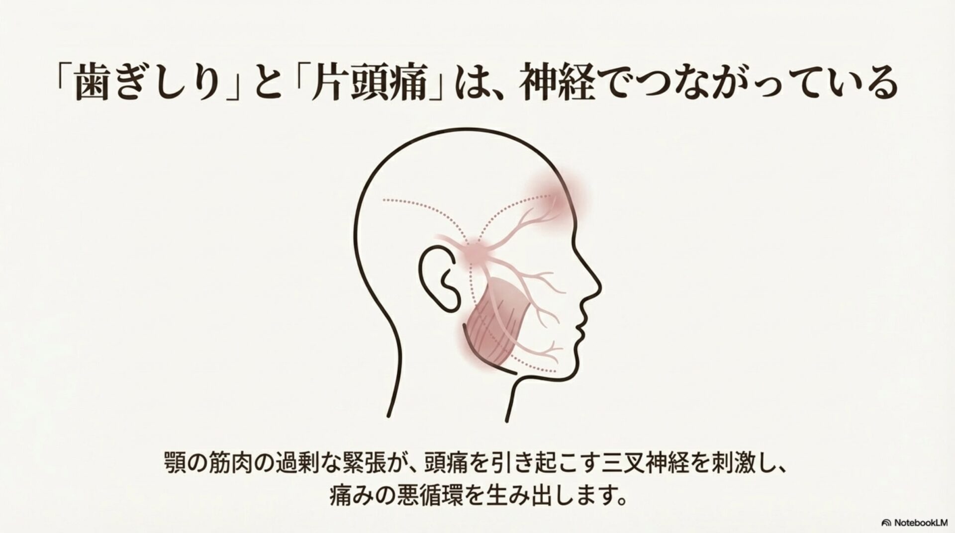 では、なぜこの二つが関係するのでしょうか?専門家は、顔の感覚を脳に伝える「三叉神経」という共通の神経経路が関わっていると考えています。歯ぎしりによってこの神経が過度に刺激されると、それが引き金となって片頭痛の発作が起こりやすくなる可能性があるのです。