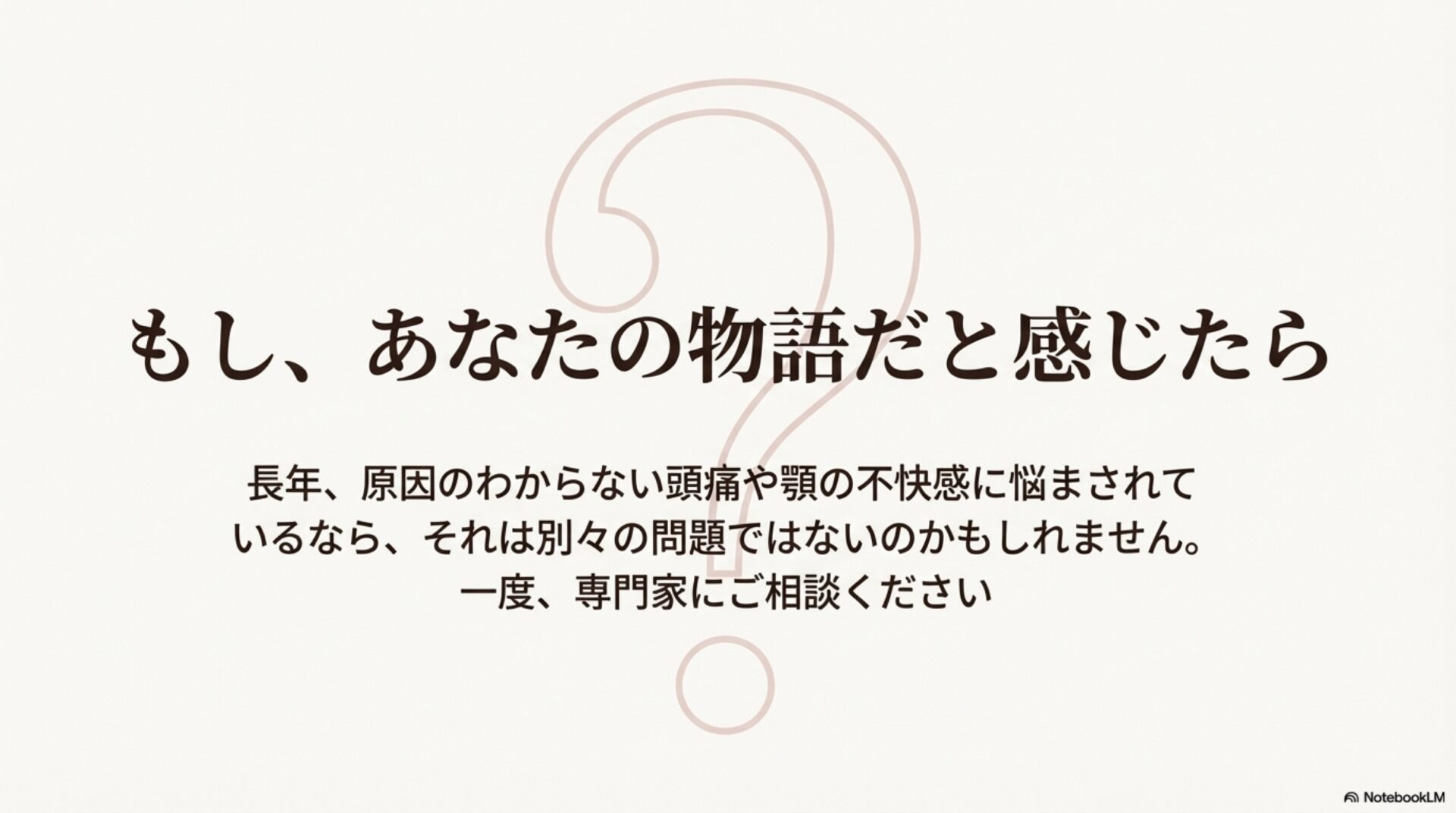 頭痛の治療は、単に痛みを抑えるだけではありません。今回の研究が示すように、歯ぎしりのような関連する問題に目を向けることで、より根本的な解決に繋がることがあります。もしお心当たりがあれば、ぜひ一度、私たち専門家にご相談ください。あなたの生活全体の質を高めるための、最適な一歩を一緒に見つけましょう。