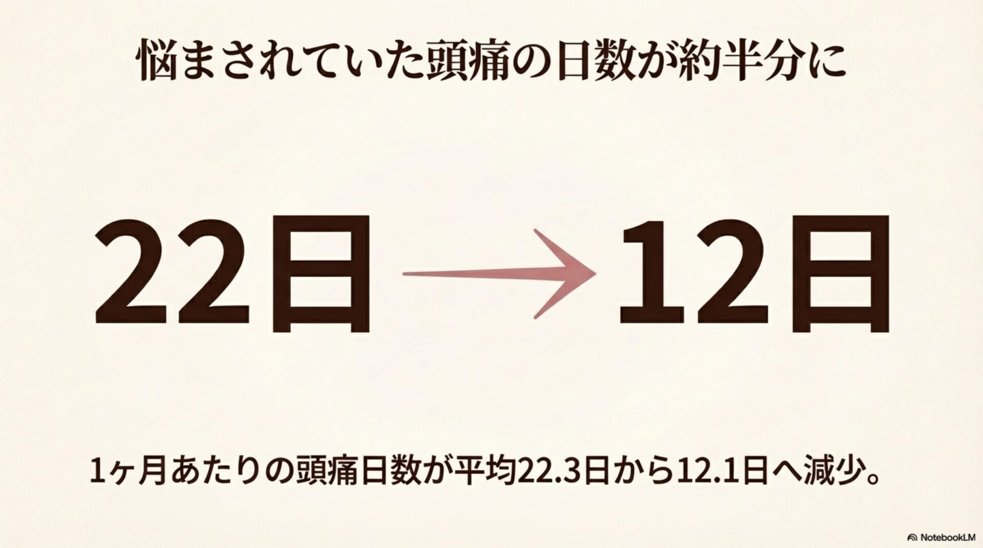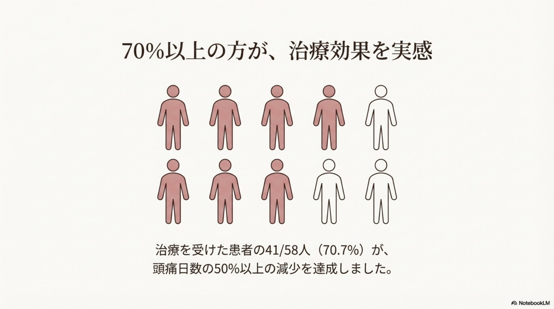 - 治療への反応: 治療を受けた患者の70.7%が、月の頭痛日数が半分以下に減少する効果を実感しました。