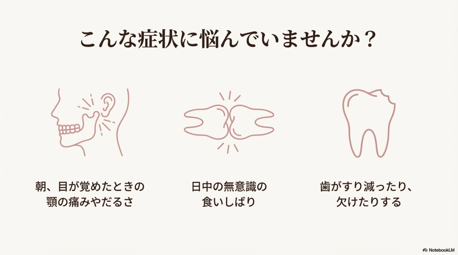 しかし、もしその長引く頭痛の原因が、ご自身でも気づいていない「歯ぎしりや食いしばり」にあるとしたら、どうでしょうか?