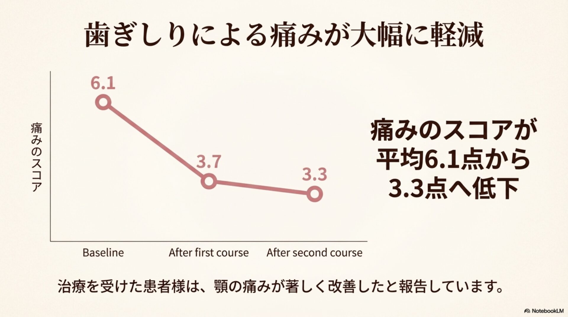 これらの数字は、この治療法が頭痛と歯ぎしりの両方に対して、客観的にも主観的にも顕著な改善をもたらすことを示しています。