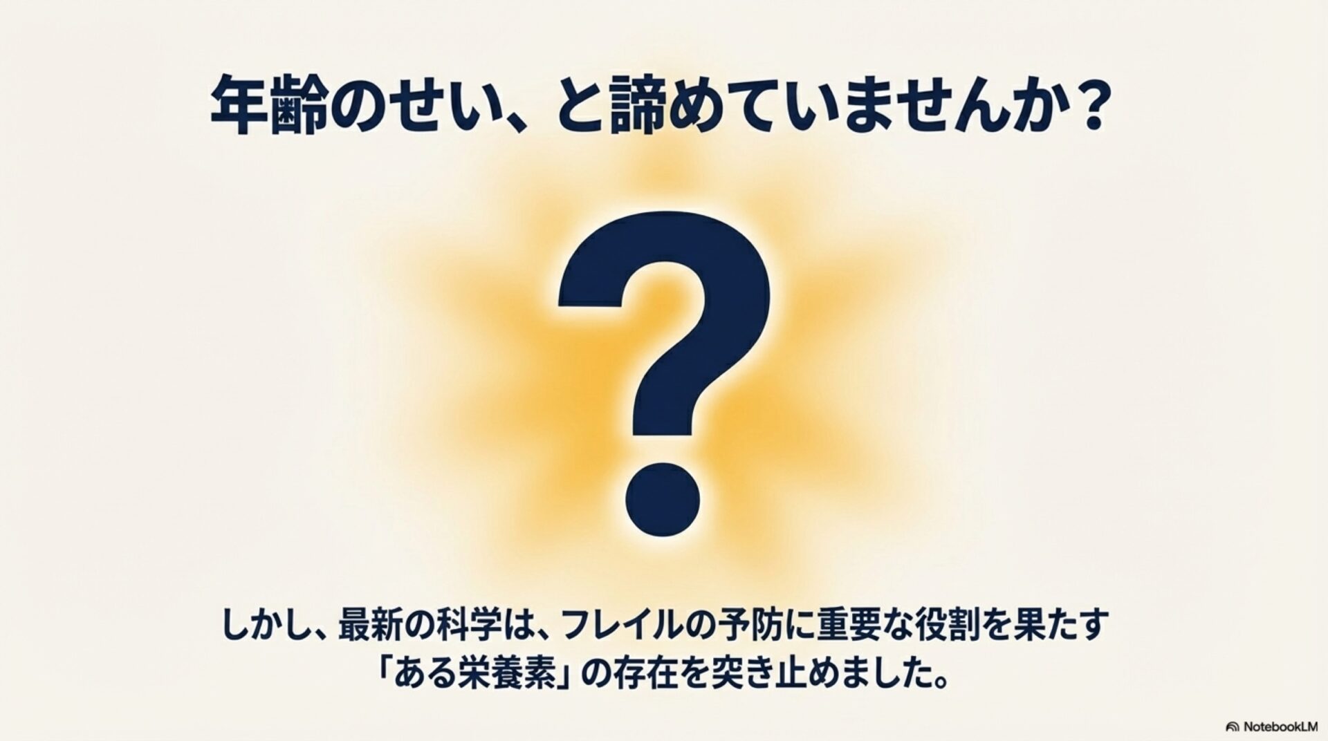 「最近、なんだか体力が落ちた気がする」「以前より疲れやすくなった」。年齢を重ねるにつれて、ご自身やご家族のこうした変化に気づくことはありませんか?多くの方が「年のせい」と考えがちですが、実はそれは「フレイル」という特定の医学的な状態のサインかもしれません。