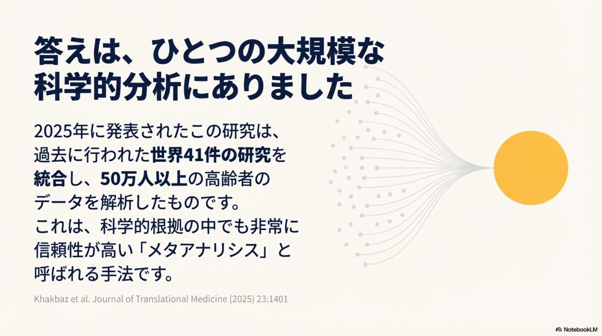 フレイルは、単なる老化とは異なり、心身の活力が低下し、ストレスに対する脆弱性が増した状態を指します。そして、このフレイルと、私たちにとって非常に身近な栄養素である「ビタミンD」との間に、驚くべき関係があることが、最近の大規模な研究によって明らかになりました。これまでの研究では、ビタミンDとフレイルの関係について様々な報告があり、専門家の間でも結論は一貫していませんでした。しかし、今回ご紹介する大規模なメタ解析は、それらの研究結果を統合し、より確かな結論を導き出したものです。今回は、その最新の研究結果から見えてきた、健康長寿の鍵を握るビタミンDの真実に迫ります。