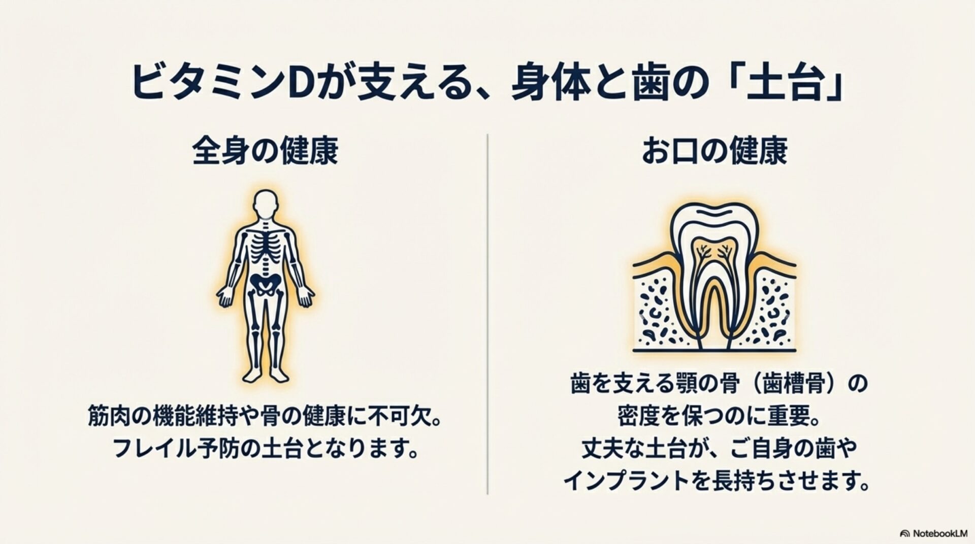 そして、一本一本の歯を支える土台である「顎の骨」も、もちろん例外ではありません。丈夫で健康な顎の骨は、安定した歯、成功率の高いインプラント治療、そしてお口全体の機能を維持するために、決して欠かすことのできない土台です。したがって、適切なビタミンDレベルを確保することは、全身の健康だけでなく、あなたの笑顔を支える構造そのものを守るための、基本的な一歩なのです。