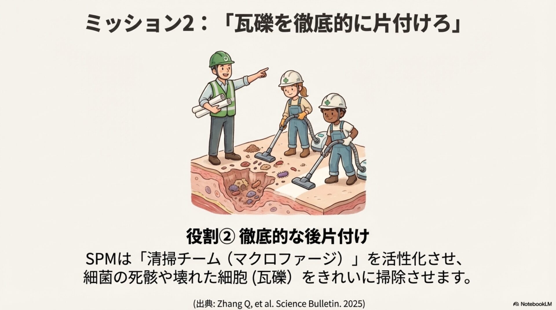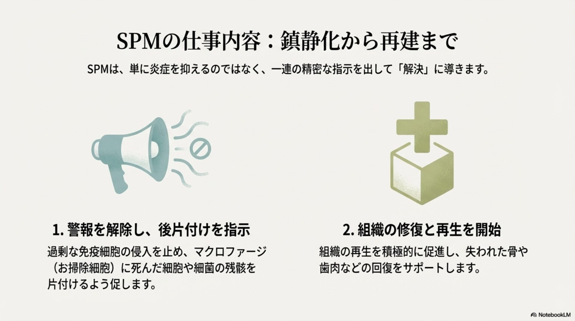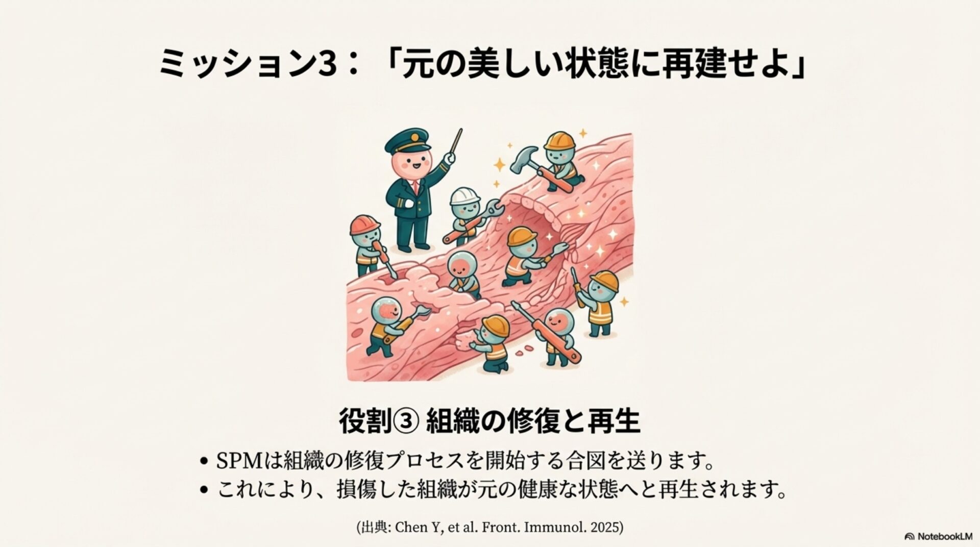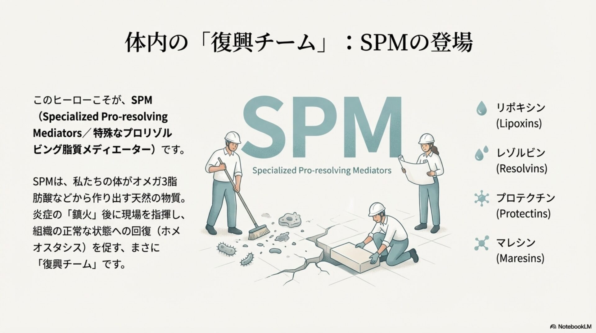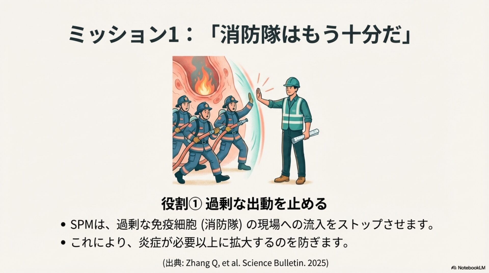 最初の発見は、治癒に対する私たちの考え方を根底から覆します。炎症を「火事」に例えるなら、従来の考え方は、燃料が燃え尽きて自然に鎮火するのを待つようなものでした。しかし、SPMの存在は、体内ではもっと積極的な活動が行われていることを教えてくれます。SPMは、火事が起きた後に現場に駆けつけ、消火活動を行い、後片付けから再建までを指揮する「専門チーム」なのです。
