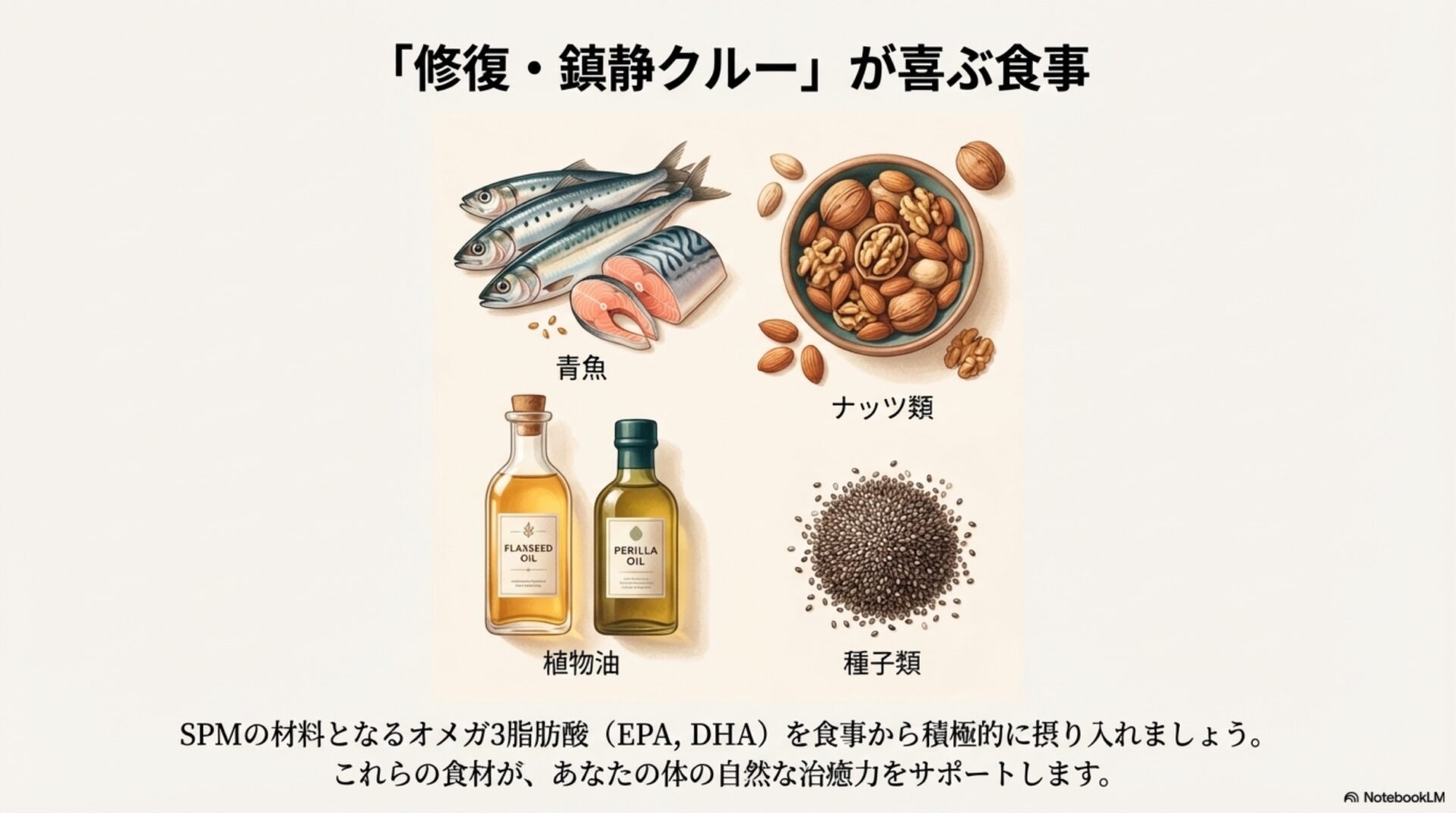 SPMは、魚油などに多く含まれるオメガ3系脂肪酸(EPAやDHA)や、特定の植物油に含まれるオメガ6系脂肪酸といった「必須多価不飽和脂肪酸」から体内で合成されます。これらは体が自ら作り出すことができないため、食事から摂取する必要がある栄養素です。これまで「健康によい脂肪」として知られてきたこれらの脂肪酸が、単なるエネルギー源にとどまらず、体内の高度な回復システムを稼働させるための不可欠な”燃料”であったことが明らかになってきました。つまり、最新の治癒科学は、古くからの知恵である「医食同源」が、分子レベルで真実であることを証明しているのです。