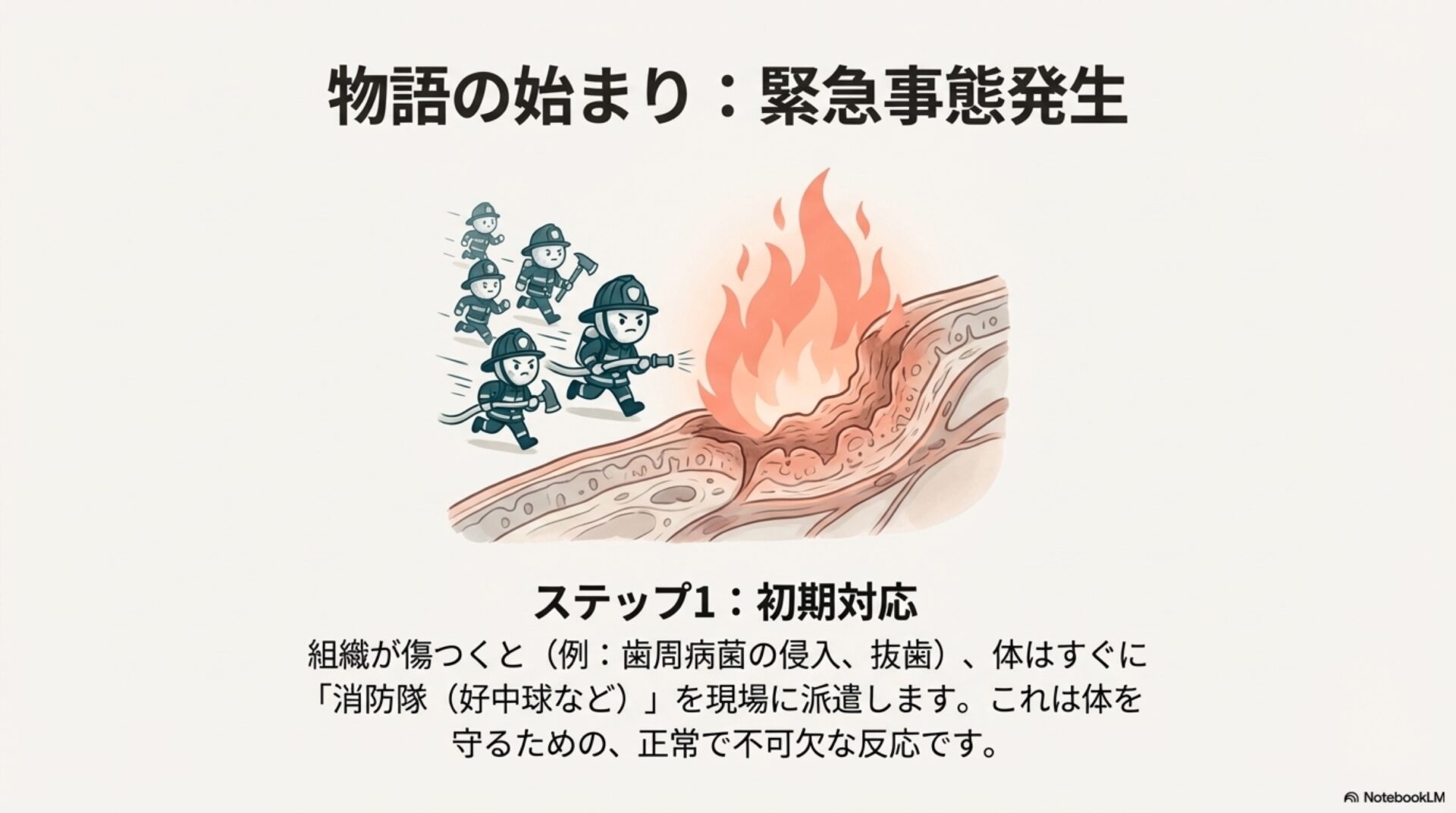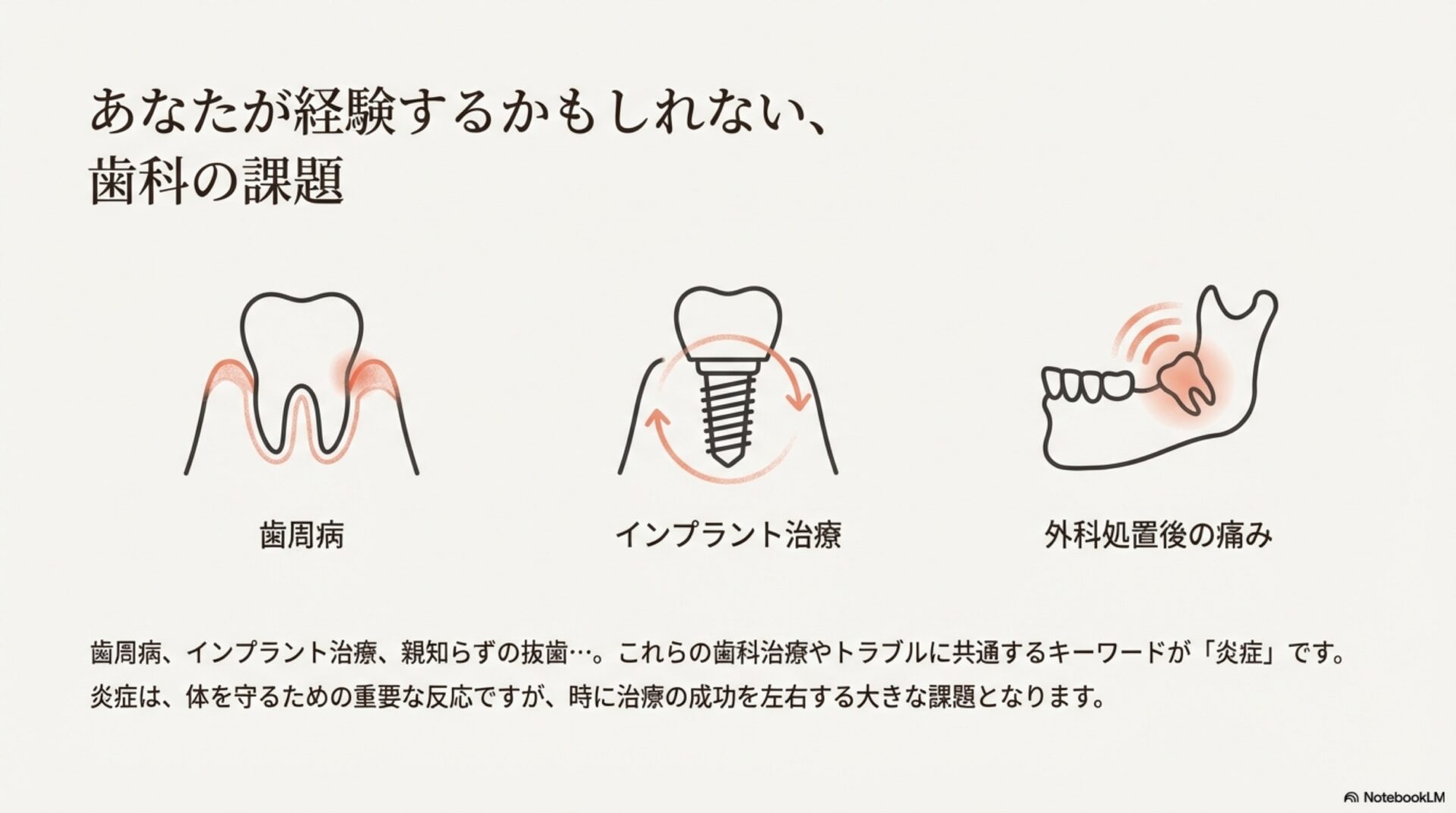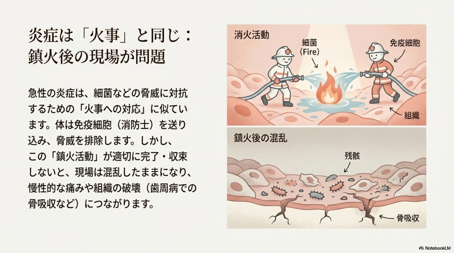 歯の治療を受けた後の腫れや痛み、あるいは思いがけないケガをしたとき、私たちは「炎症が治まるのを待つ」のが当たり前だと思っています。時間が経てば、体は自然に元の状態に戻っていく。しかし、その「待っている」間、私たちの体内では、ただ時が過ぎるのを受動的に見ているだけなのでしょうか。