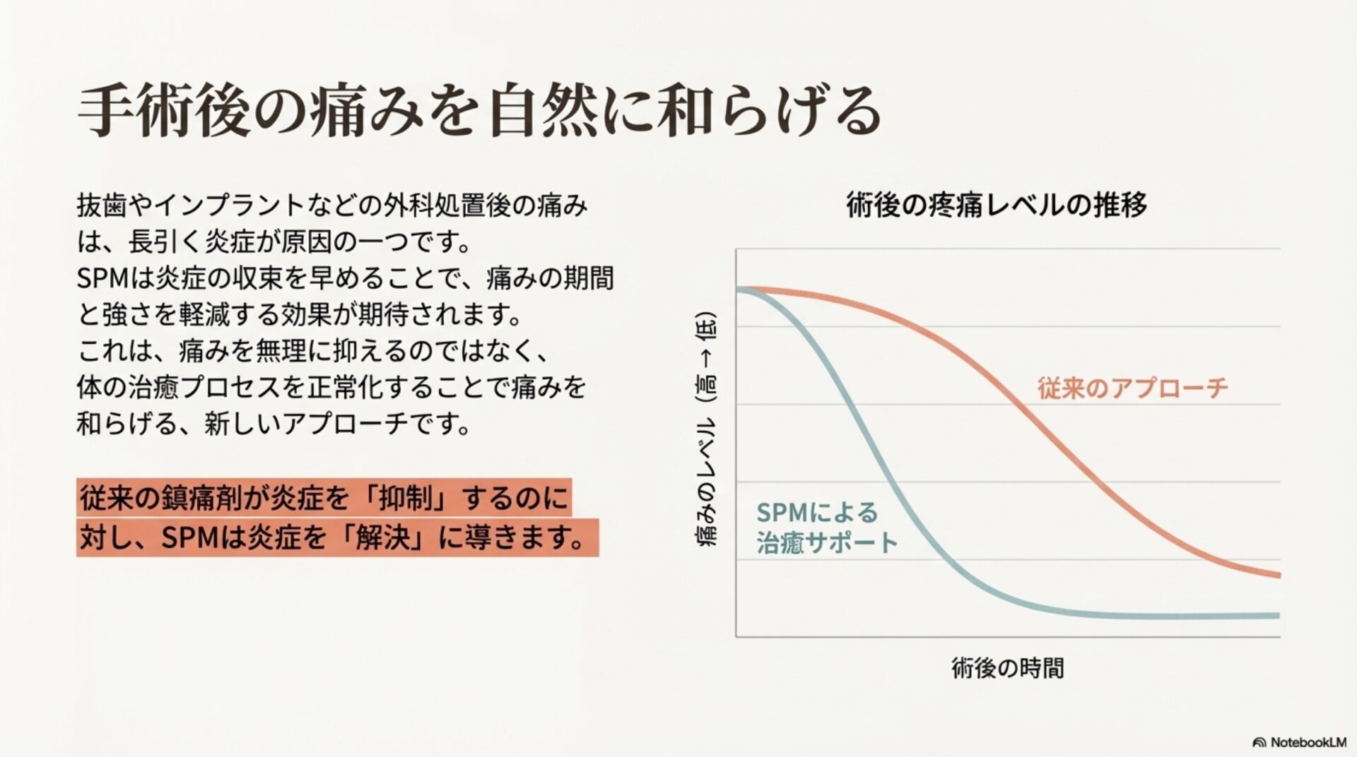 歯科治療、特に手術後の痛みは多くの患者さんにとって大きな懸念事項です。現在使われている鎮痛薬には副作用のリスクが伴うことがあります。SPMは、この痛み管理のあり方も変える可能性を秘めています。