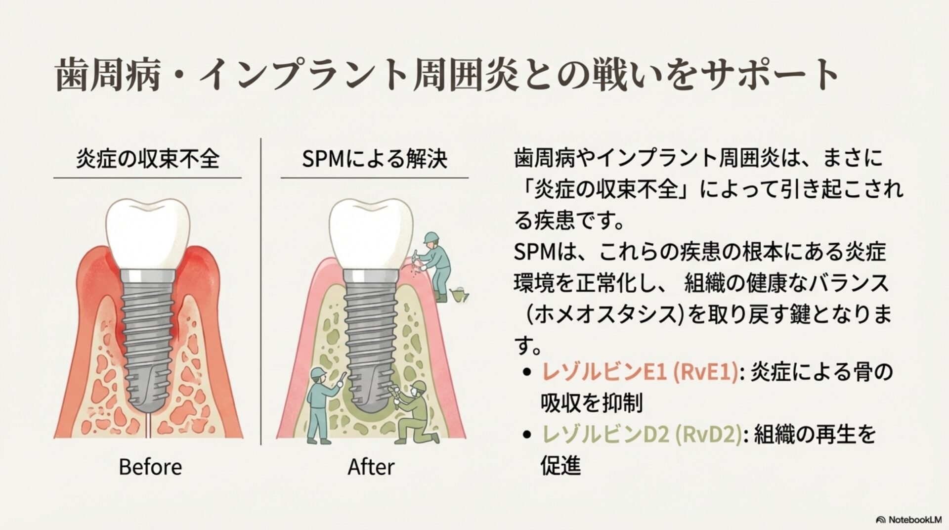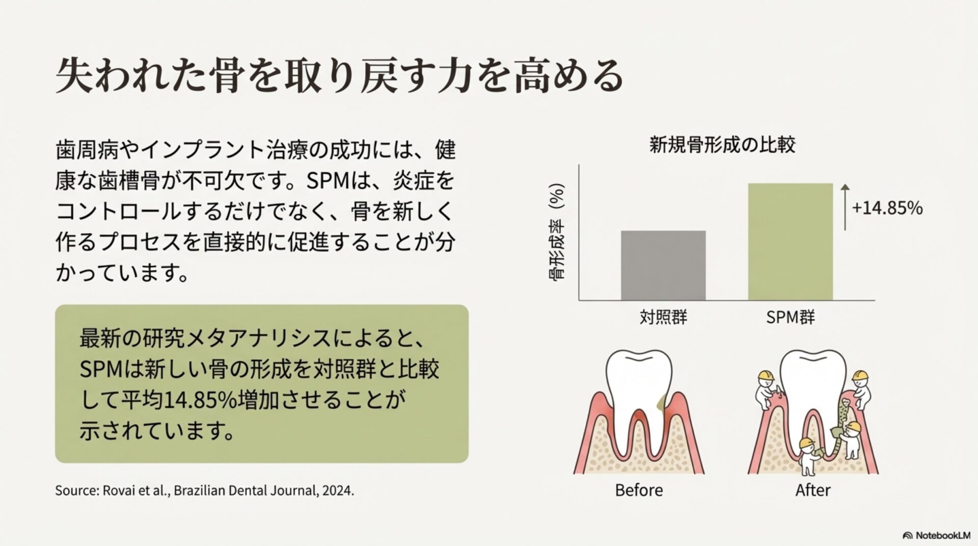 SPMの持つ組織修復能力は、特に骨の再生が重要となる歯科治療の分野で大きな期待が寄せられています。そして、その可能性を示唆する非常に興味深いデータが、基礎研究の分野から報告されています。