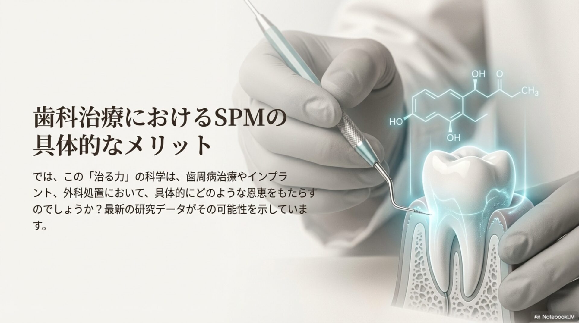 実は、私たちの体はもっと驚くべき物語を紡いでいます。そこでは、まるで熟練の指揮者のように、治癒のプロセスを積極的にコントロールするヒーローが働いているのです。この記事は、そんな体内のヒーロー、「特殊なプロリゾルビング脂質メディエーター(Specialized Pro-resolving lipid Mediators)」、略してSPMを発見する旅です。この「スーパー回復物質」が持つ5つの驚くべき事実を解き明かし、特に歯科治療の未来にどのような革命をもたらす可能性があるのかを探っていきましょう。