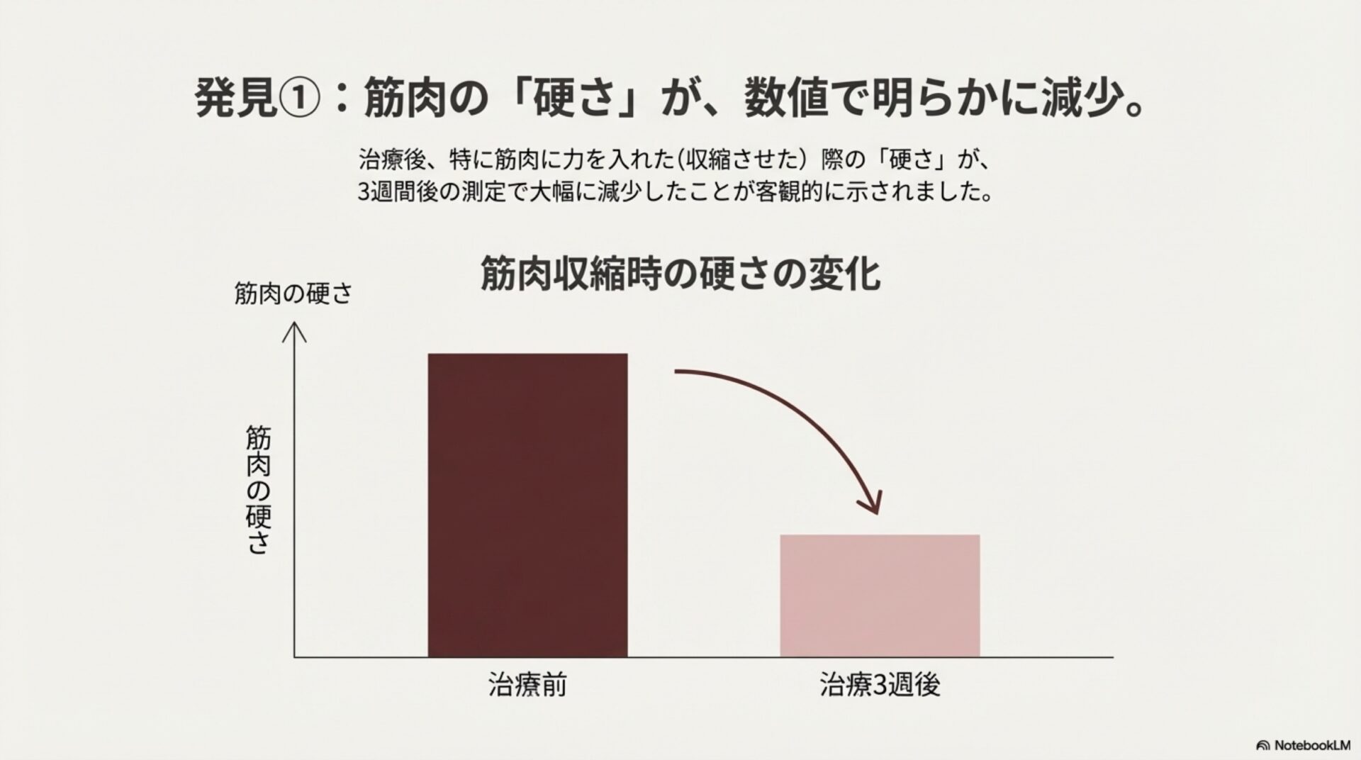 - 弾力性: 硬くなった輪ゴムが伸び縮みしにくいように、緊張した筋肉も弾力性を失います。治療によって、この筋肉本来のしなやかな「伸び縮みする力」が回復したことが示されました。