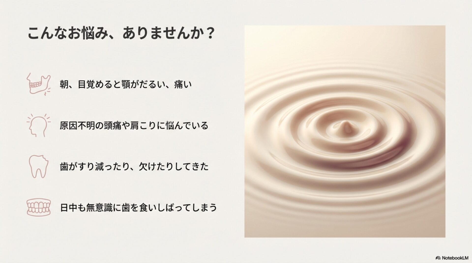 「朝起きると顎がだるい」「日中、無意識に歯を食いしばっている」「原因不明の頭痛や肩こりに悩んでいる」…こうした症状に、心当たりはありませんか?