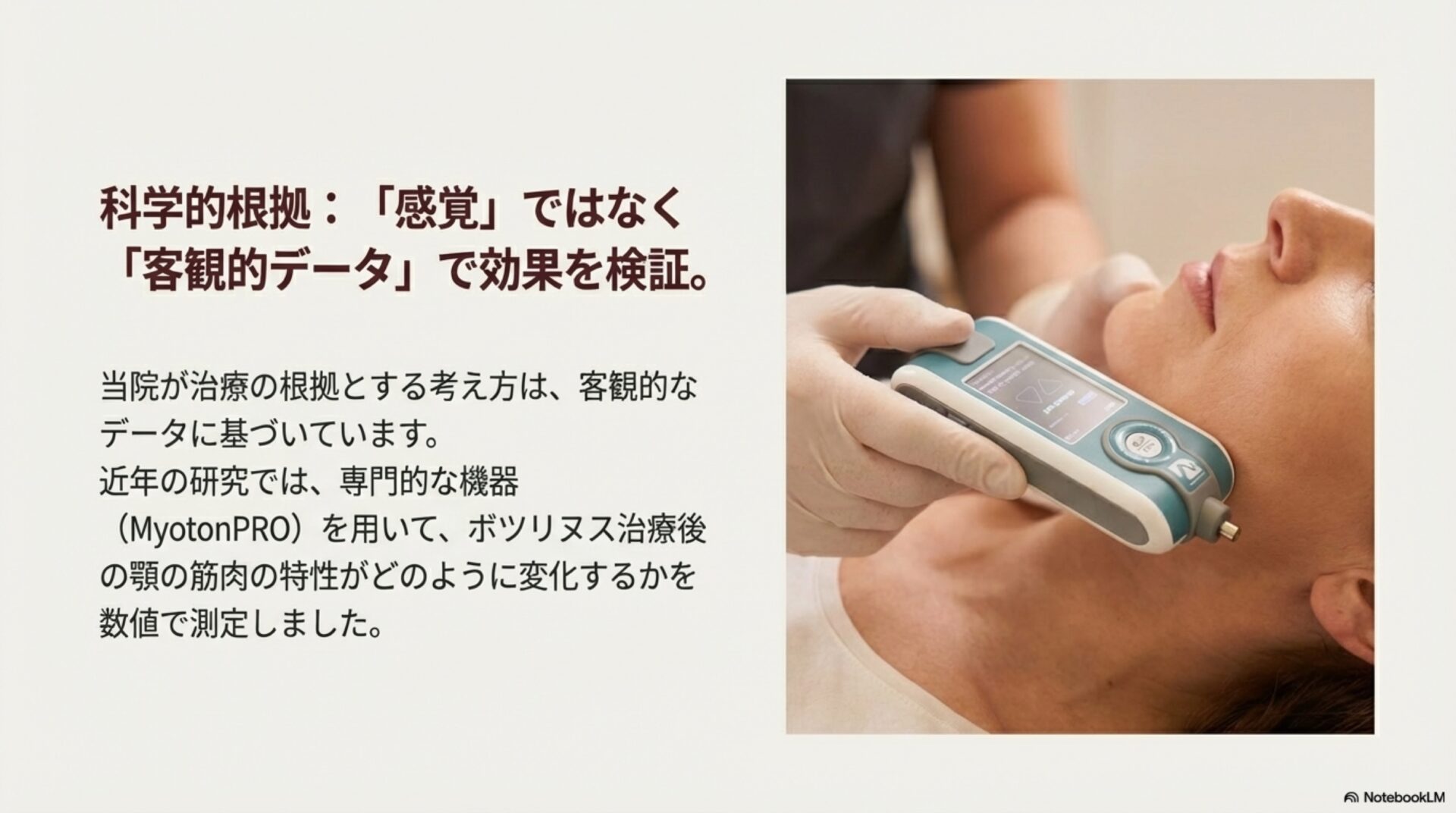 もしあなたが、長引く顎の痛みや食いしばりが原因の頭痛に悩んでいるなら、ご自身の筋肉の状態を客観的に評価することが、あなたに合った最適な治療法を見つけるための重要な鍵になるかもしれません。ぜひ一度、専門のクリニックにご相談ください。