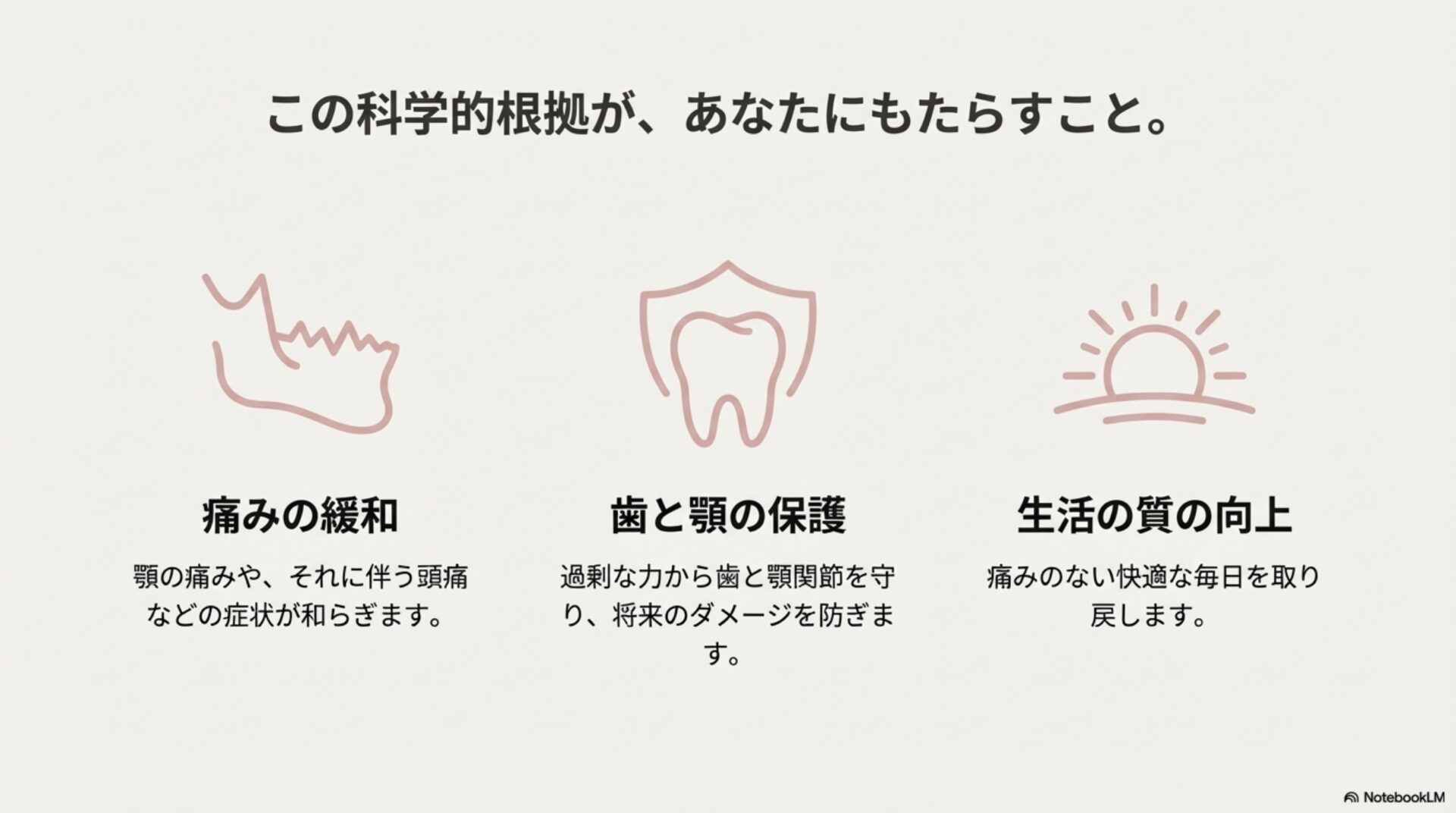 ボトックス治療は、食いしばりが引き起こす辛い症状に対する、科学的に検証された有効なアプローチの一つです。そして、特に筋肉の過緊張に悩む方々にとって、大きな希望となる可能性を秘めています。