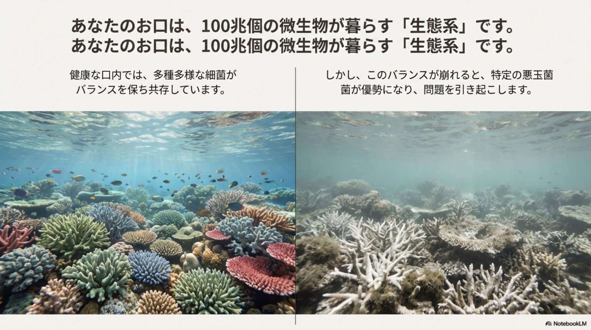 一口に「お口のケア」と言っても、特定の悪玉菌だけでなく、口内細菌全体のバランス(マイクロバイオーム、つまり口内細菌の生態系)を整えることが、がん予防という観点からも極めて重要になるのです。
