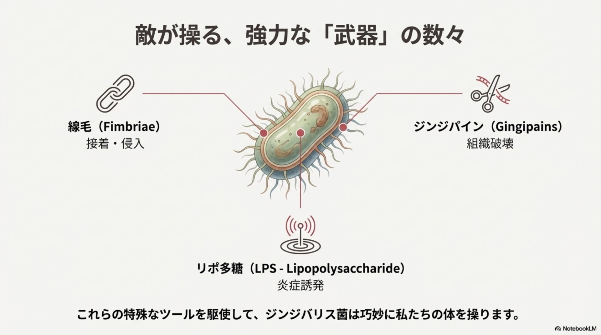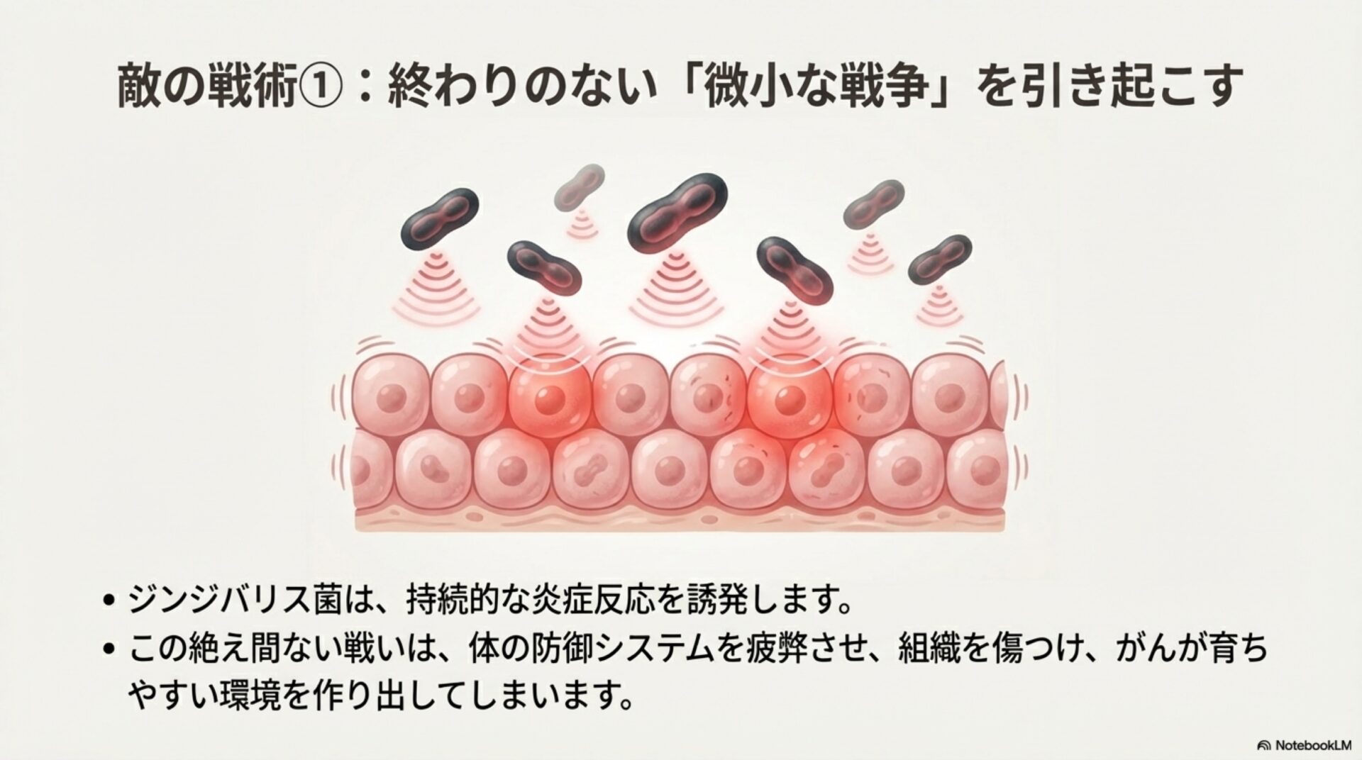 しかし、この菌の恐ろしさは、単にリスク因子となるだけではありません。次に、私たちの体を守るはずの免疫システムを、いかにして手玉に取るのかを見ていきましょう。