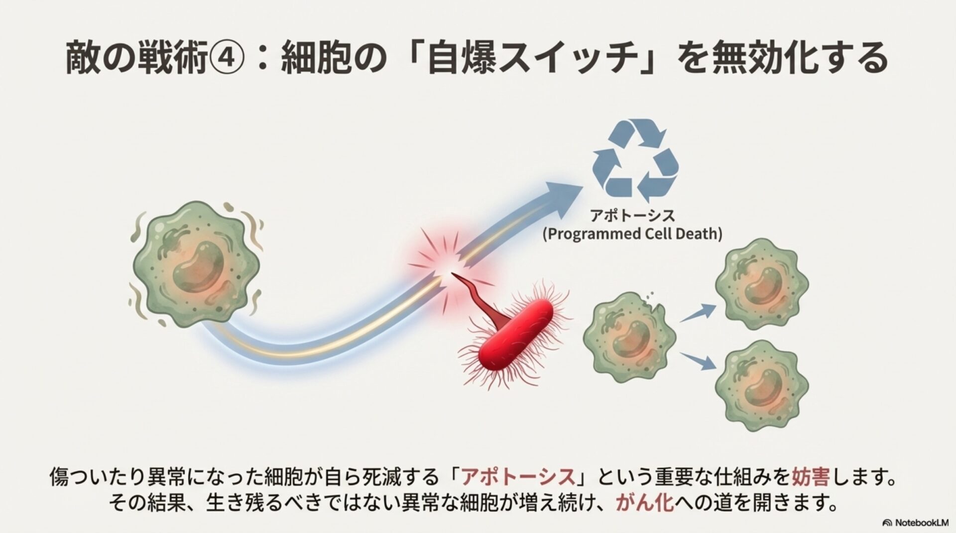 免疫の目から逃れるだけでは飽き足らず、歯周病菌はさらに狡猾な手口を使います。私たちの細胞には、異常が発生した際に自ら死を選ぶ「アポトーシス(プログラム細胞死)」という、がん化を防ぐための重要な安全機能が組み込まれています。驚くべきことに、私たちの細胞が持つこの重要な安全装置を、一介の細菌が停止させてしまうのです。これは何を意味するのでしょうか?