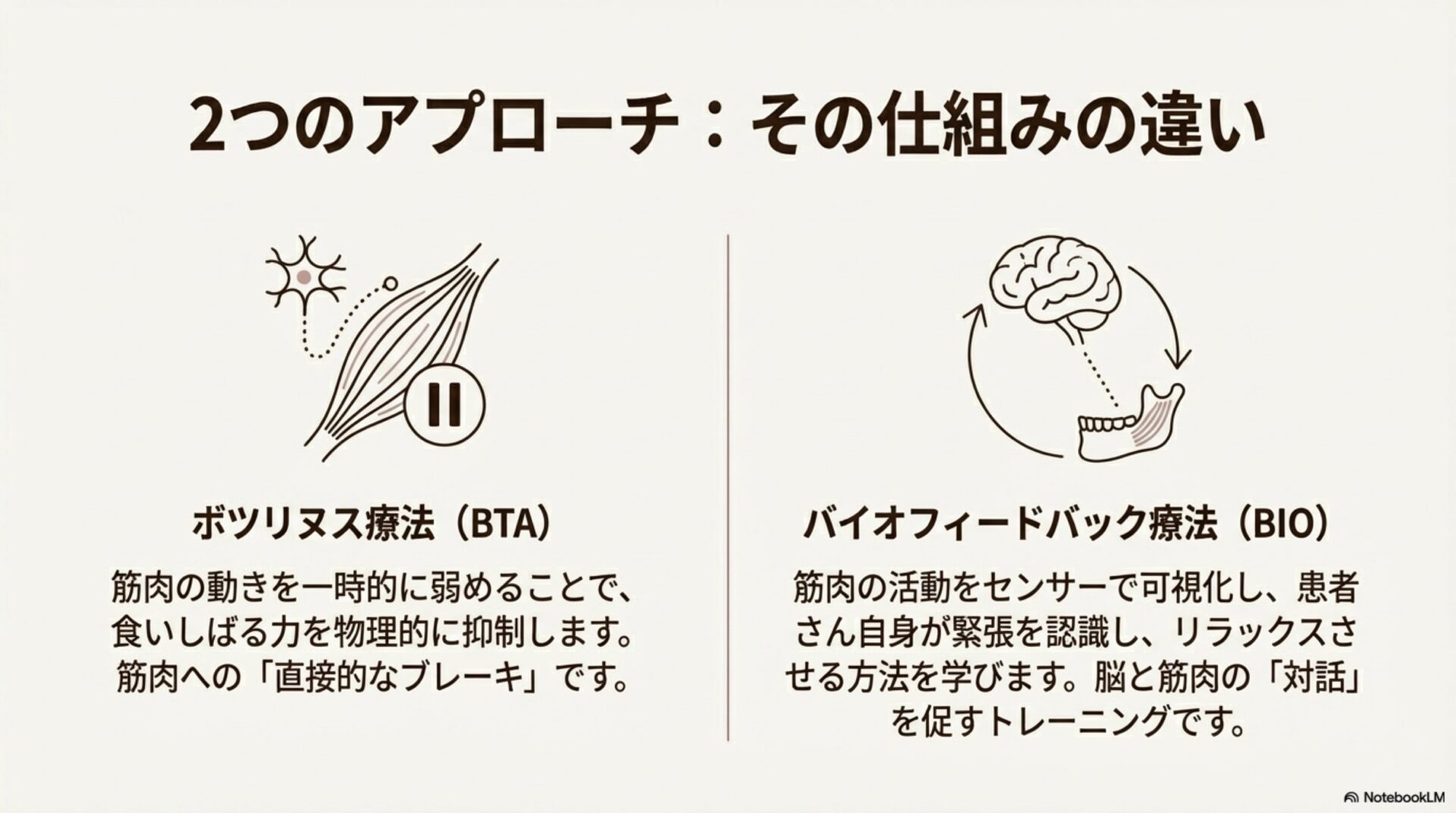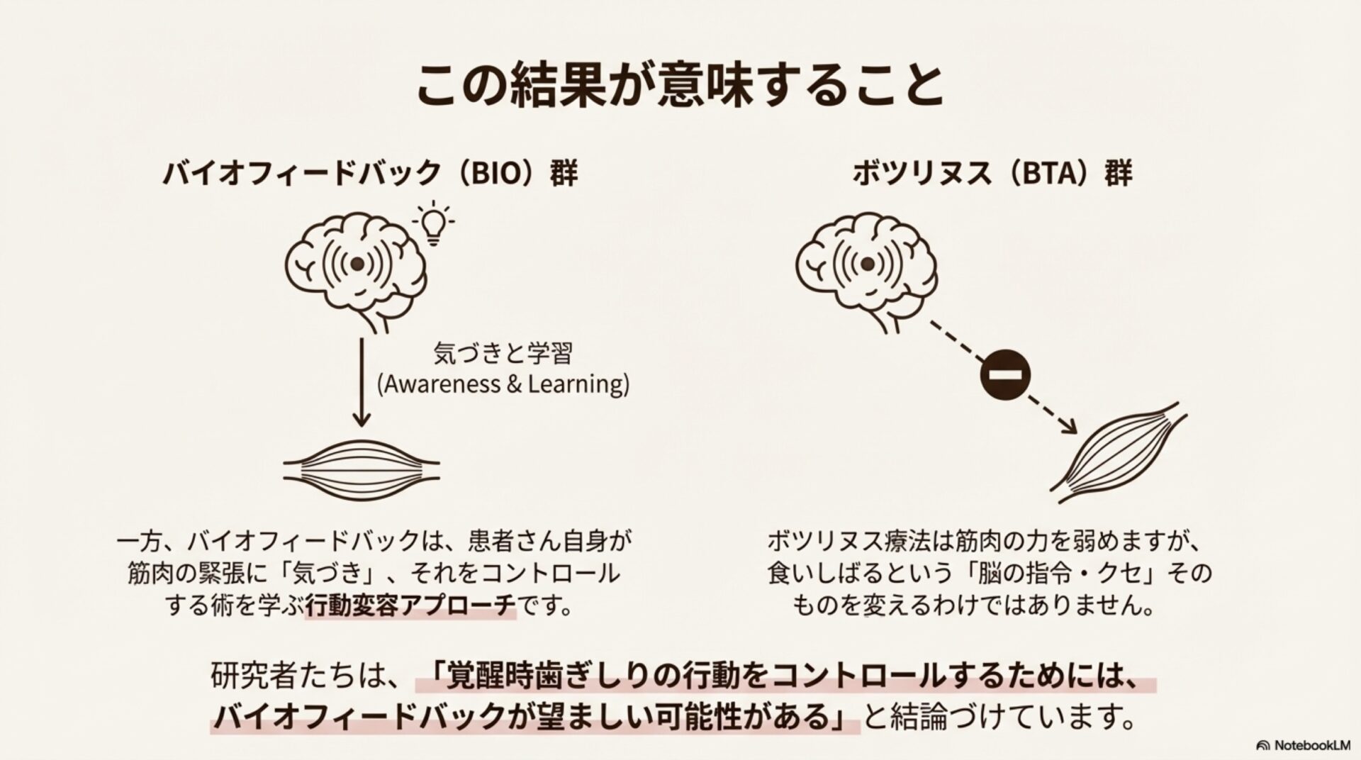 ただし、ここで最も重要な注意点があります。BIO療法がボトックス注射よりも統計的に優れていたわけではありません。2つの治療法を直接比較した結果、両グループ間に有意な差は見られませんでした。それでもこの結果は、筋肉を化学的に麻痺させる注射とは異なり、自己認識を高める非侵襲的なアプローチが、食いしばりの癖そのものを変えるための有望な道筋であることを示唆しています。
