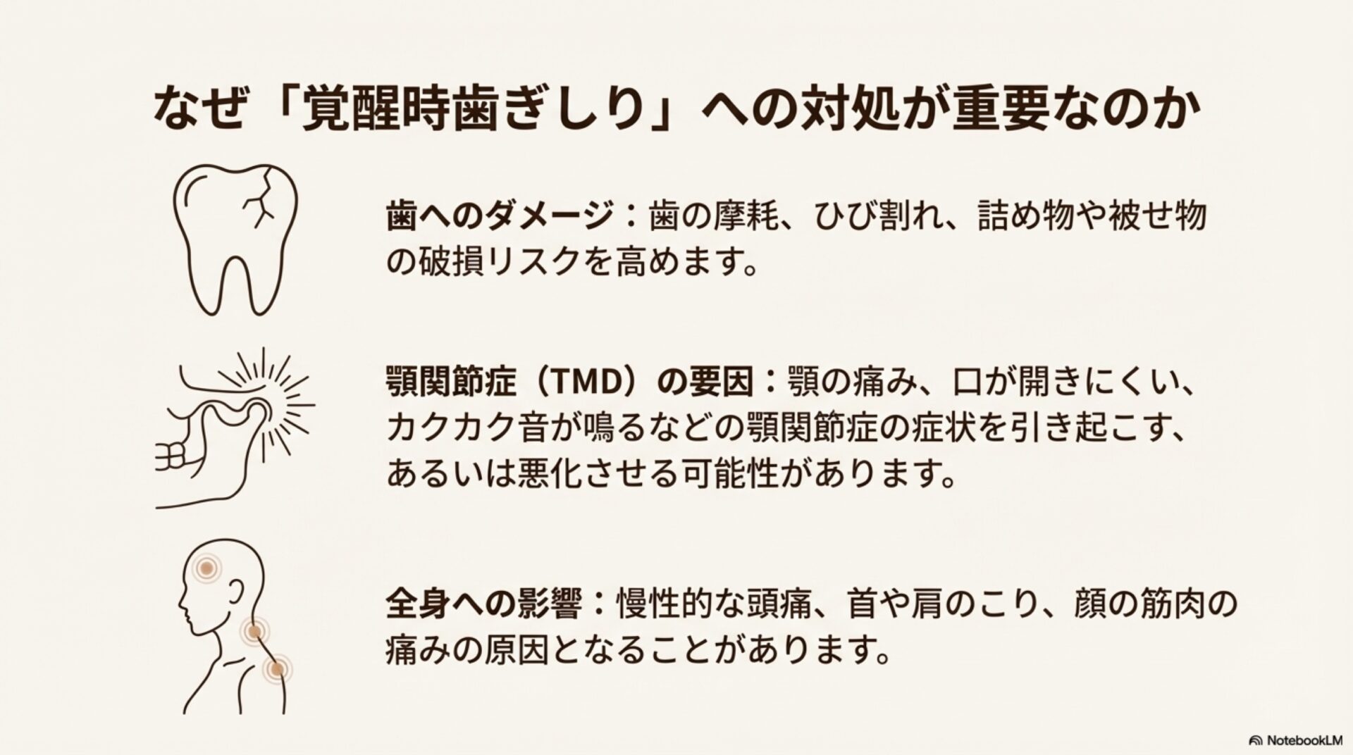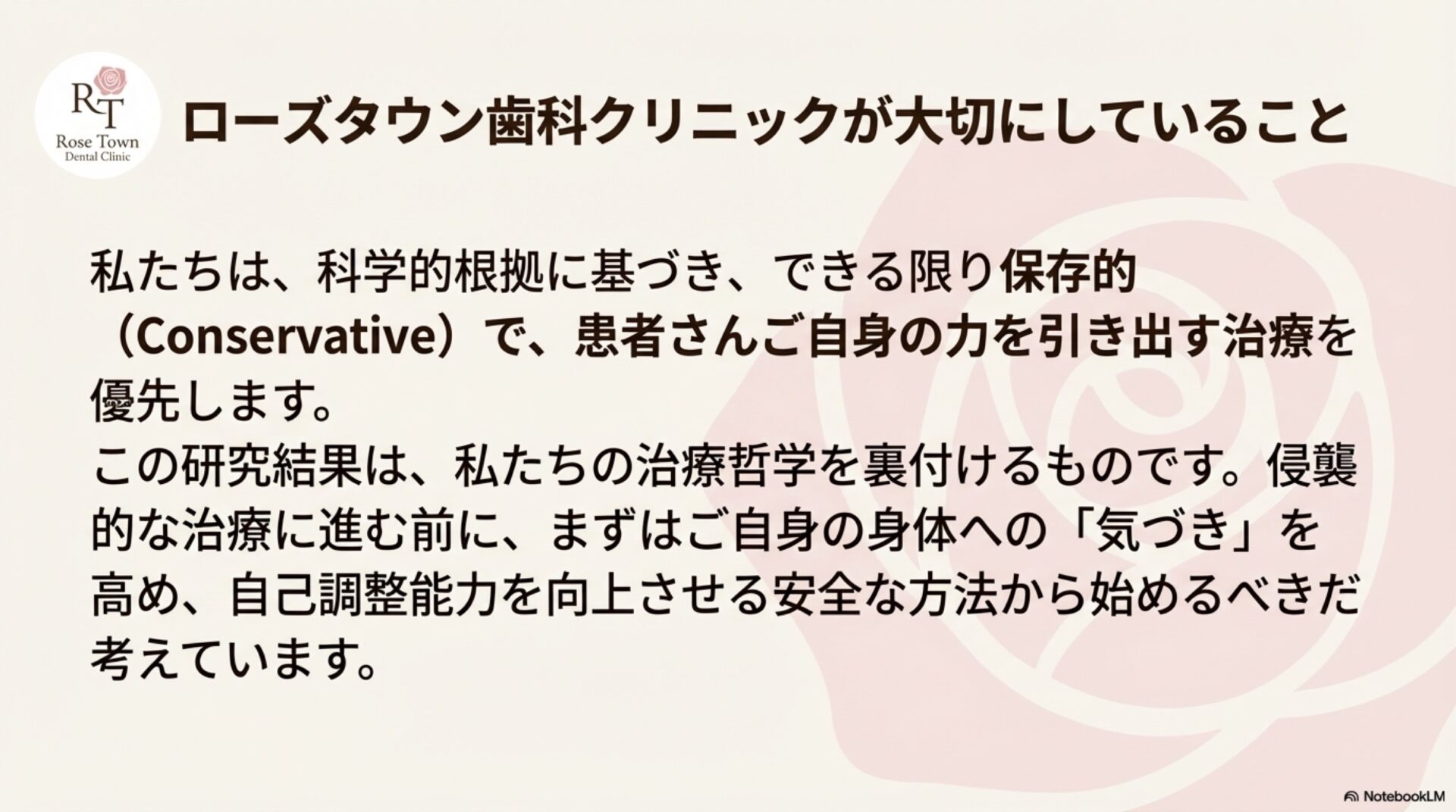 これは、顎関節症の複雑さを浮き彫りにしています。顎の痛みは、単に食いしばりだけが原因ではなく、関節の問題など多くの要因が絡み合って生じるものです。したがって、一つの「特効薬」に頼るのではなく、包括的なアプローチが必要であることをこの研究は教えてくれます。