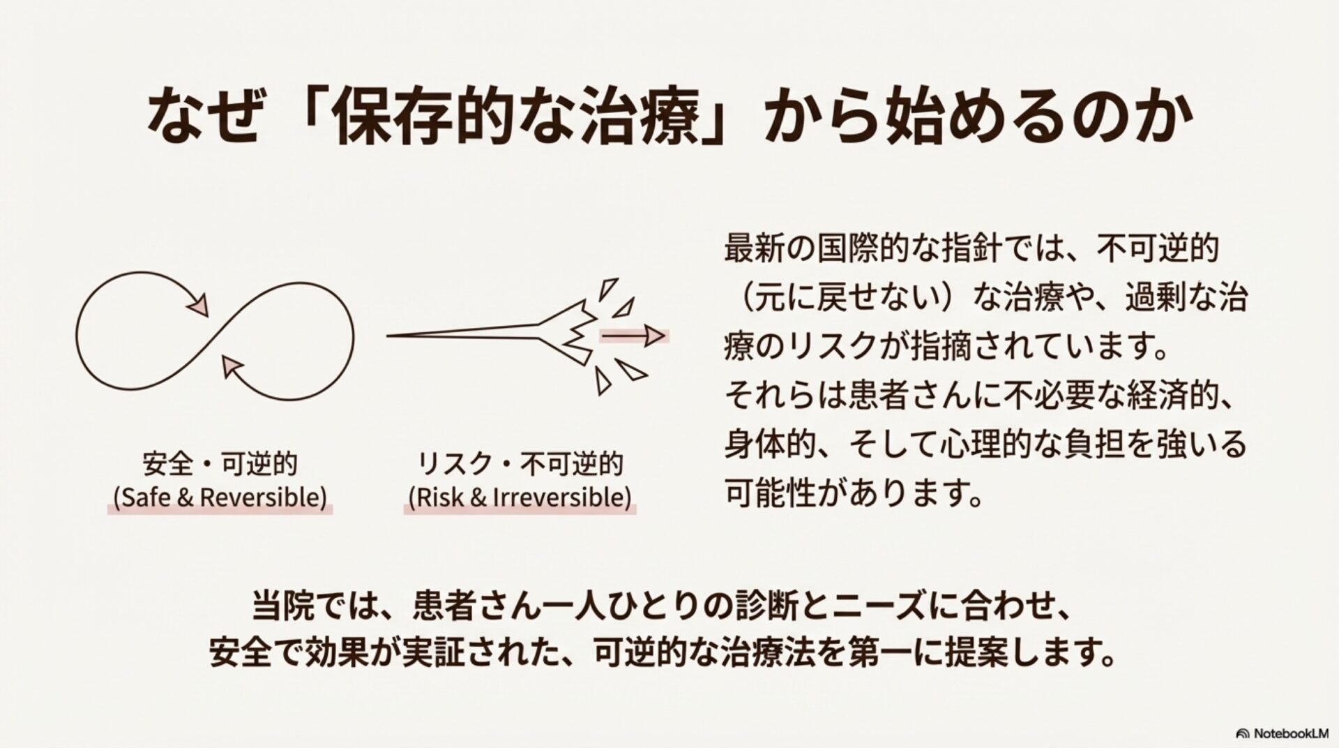 この研究はまた、治療を選択する際に、過剰な治療を避け、「保守的で、科学的根拠に基づき、可逆的な(元に戻せる)ケア」を優先することの重要性を強調しています。
