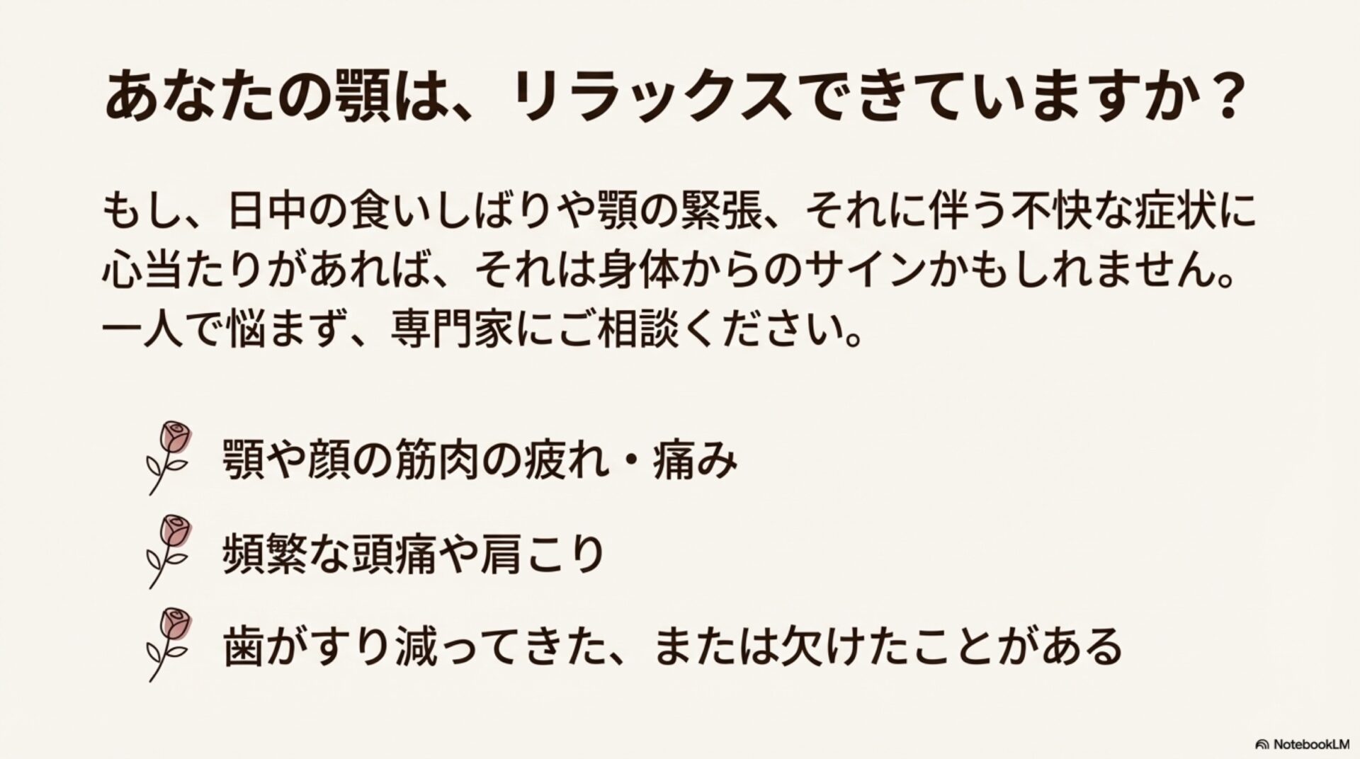 「仕事中や何かに集中している時、無意識に上下の歯をくっつけていませんか? まずは自分の癖に『気づく』こと、それが改善への最も大切な第一歩かもしれません。」