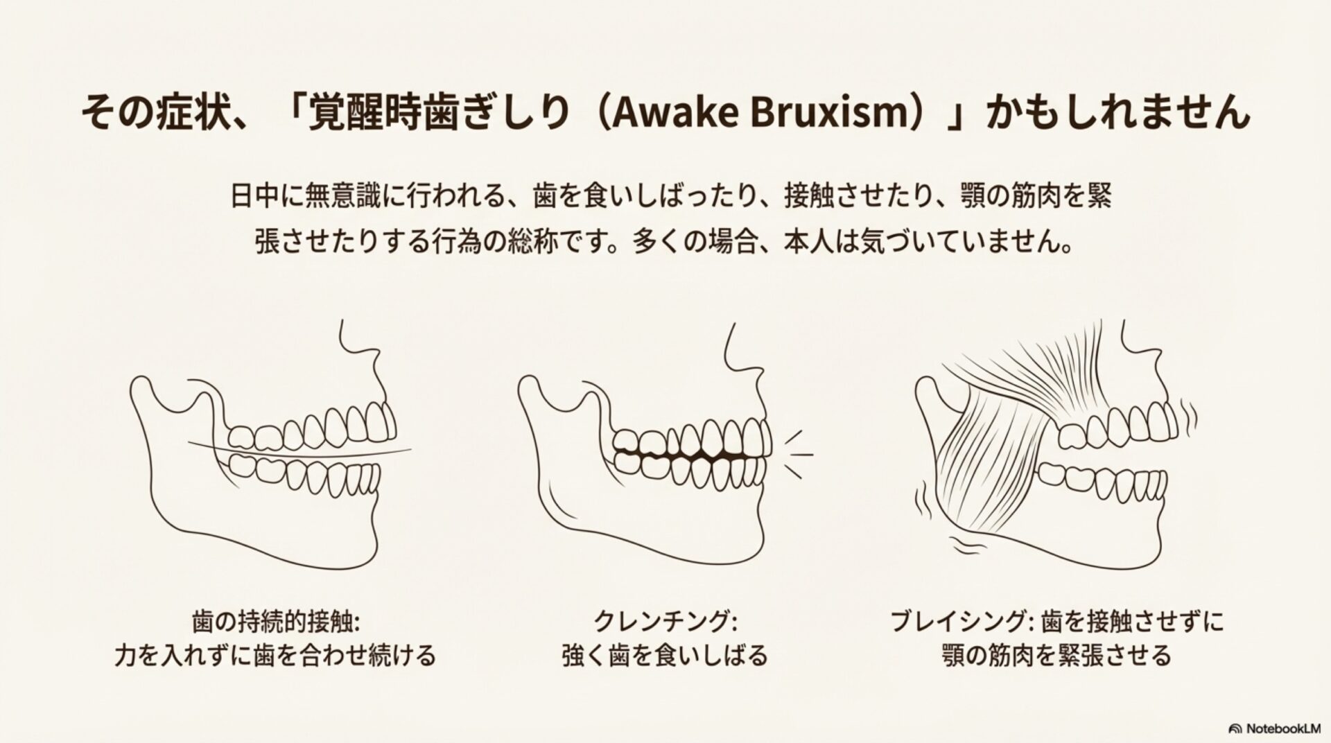 仕事中や家事に集中している時、あるいはストレスを感じた時、無意識に上下の歯を軽く接触させたり、ぐっと噛みしめたりしていませんか? この日中の食いしばり(覚醒時ブラキシズム)は、多くの人が自覚のないまま行ってしまう「静かな癖」です。